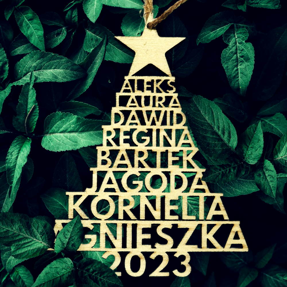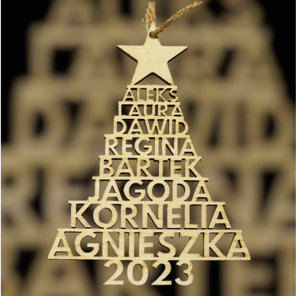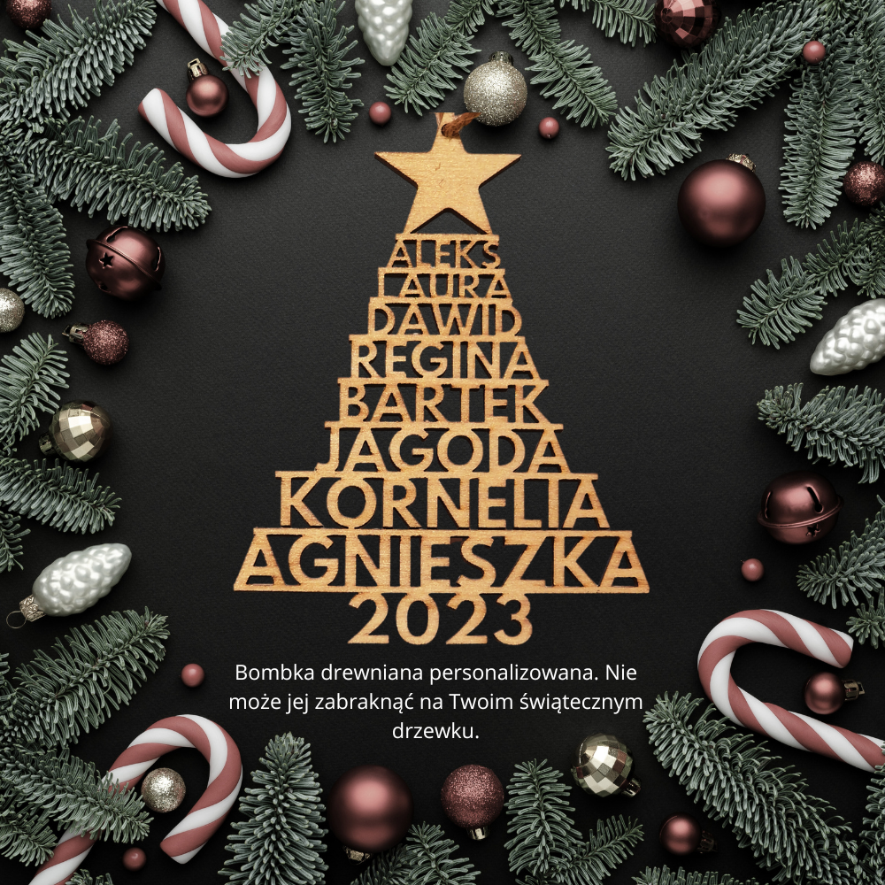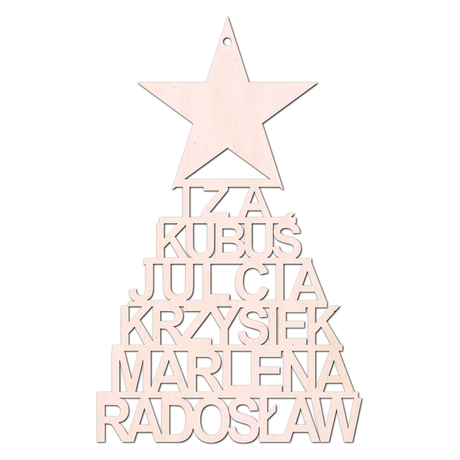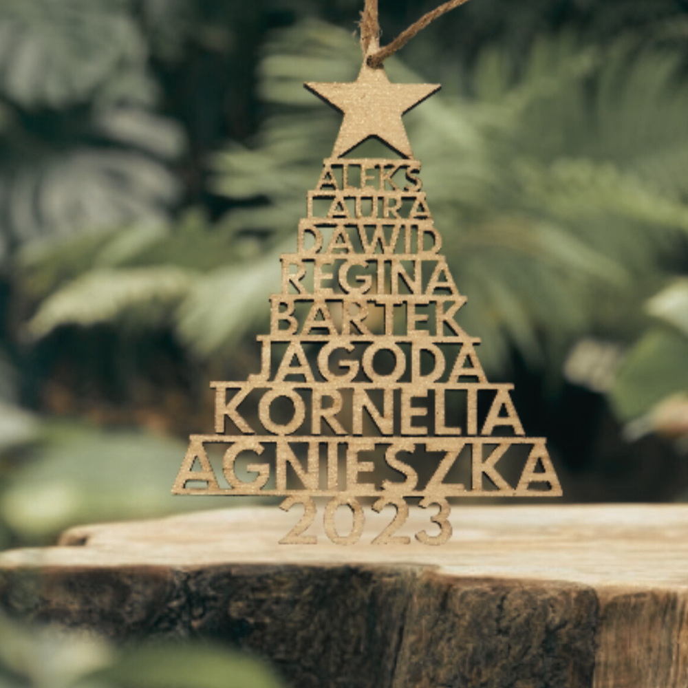 Personalizowana Bombka drewniana z imionami w kształcie choinki