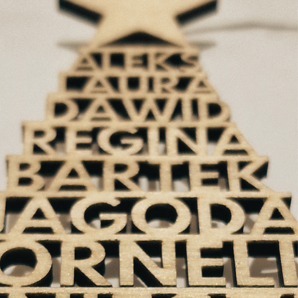 - Imiona, które podasz zostaną przez nas ułożone w takiej kolejności i powiększone w taki sposób aby tworzyły jak najbardziej zbliżony kształt przypominający choinkę.
