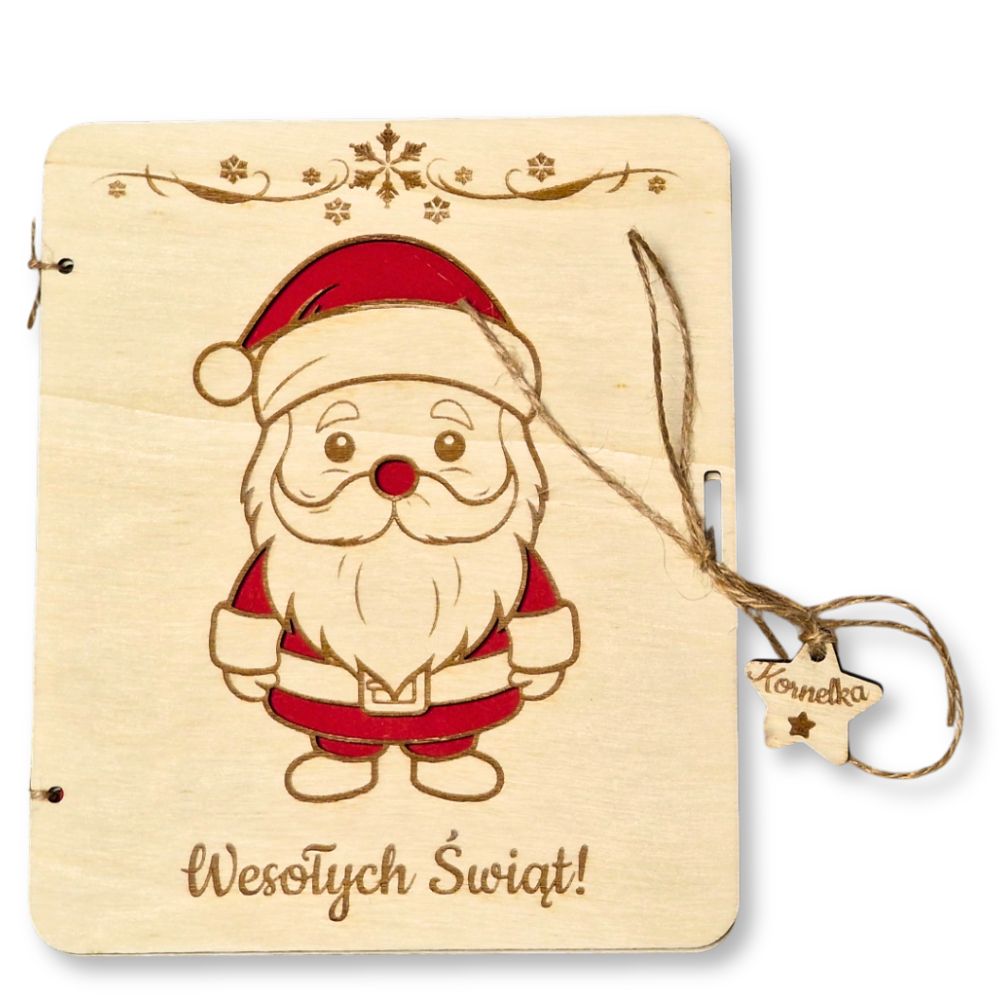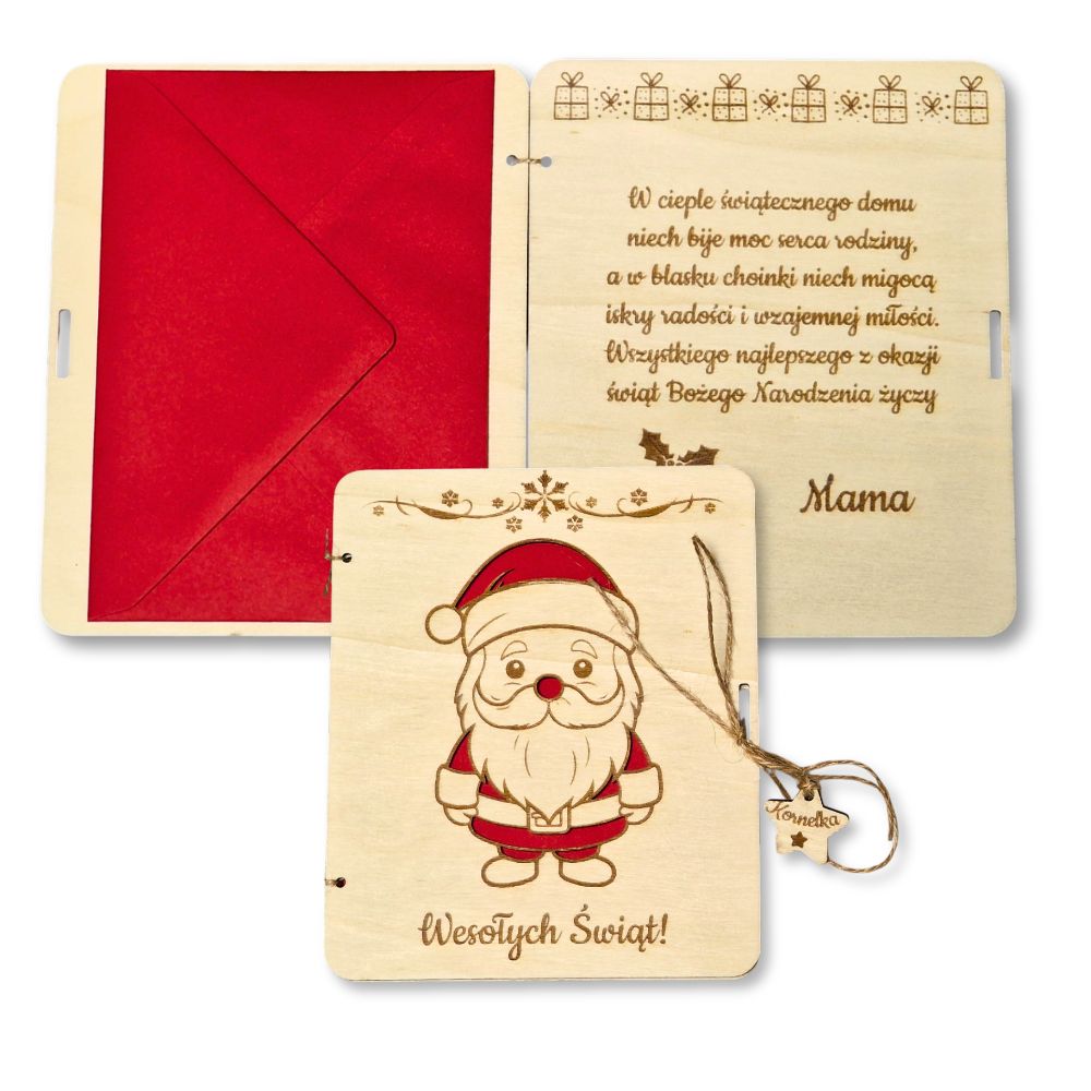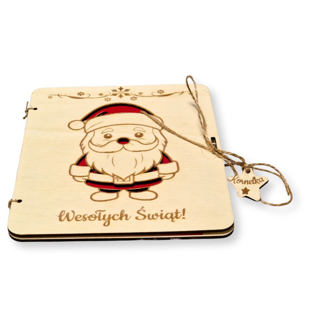 Kartkę wykonujemy z drewna, z grawerowaną okładką z motywem Mikołaja. Okładka zawiera tekst „Wesołych Świąt”. Czerwone elementy Mikołaja na okładce zawdzięczamy odpowiednio wyciętym otworom i przymocowanej kopercie wewnątrz drewnianej kartki, w której można bezpiecznie umieścić gotówkę lub inny prezent, zapewniając jego bezpieczne przechowanie. Dodatkowo, wnętrze kartki zawiera wygrawerowane życzenia, które można dostosować do własnych potrzeb. Do kartki dołączona jest Gwiazdka z wygrawerowanym imieniem oraz sznurek jutowy do jej przewiązania.