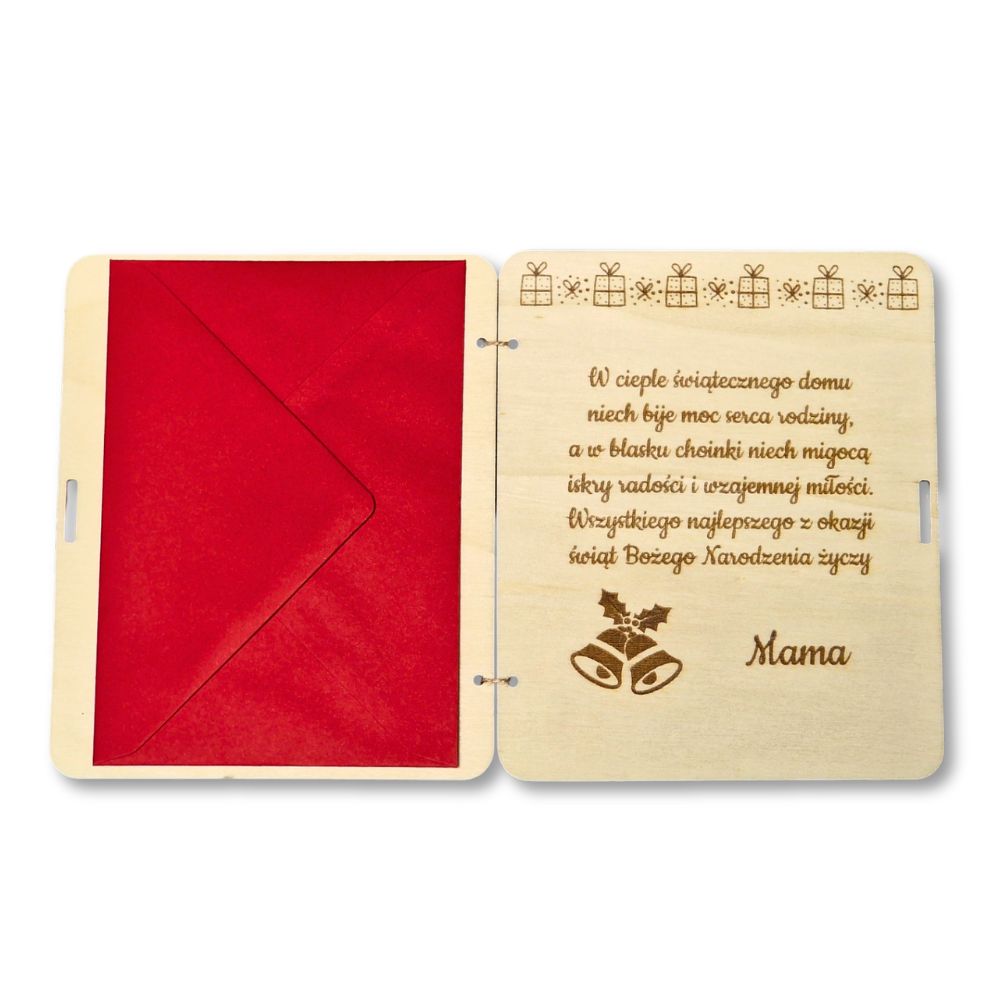 Wyjątkowa drewniana kartka Świąteczna z przymocowaną kopertą to idealny sposób na wręczenie pieniędzy i przekazanie życzeń. Dzięki takiej formie wręczysz trwałą pamiątkę oraz przekażesz piękne spersonalizowane życzenia pod choinkę.