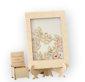 - Pojemność na Aniołki: Ramka została specjalnie zaprojektowana z myślą o zbieraniu podpisów od gości podczas uroczystości chrztu. Wewnątrz ramki można umieścić aż 12 aniołków o wymiarach ok. 5 cm każdy, co pozwala na gromadzenie życzeń, błogosławieństw i słów wsparcia od bliskich.