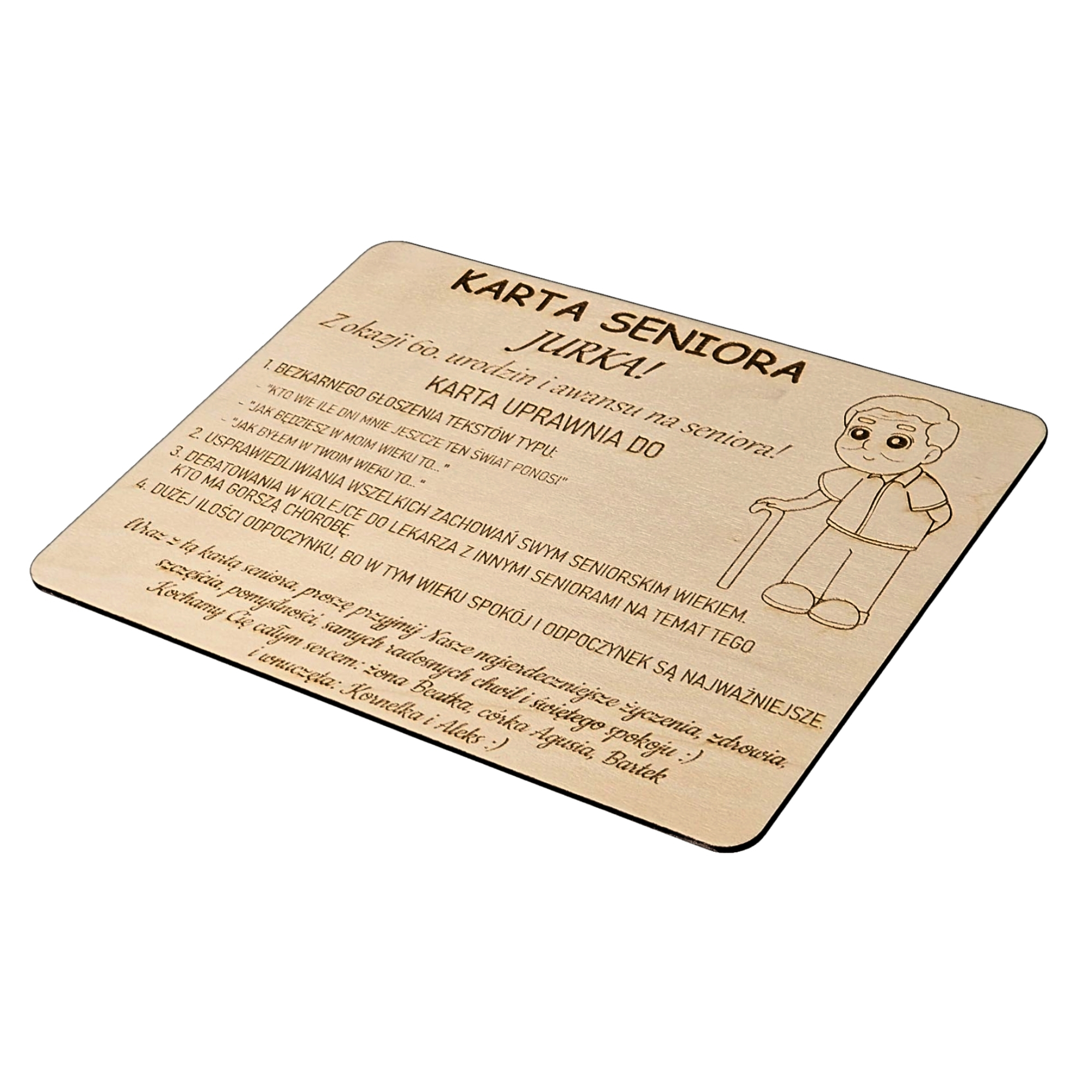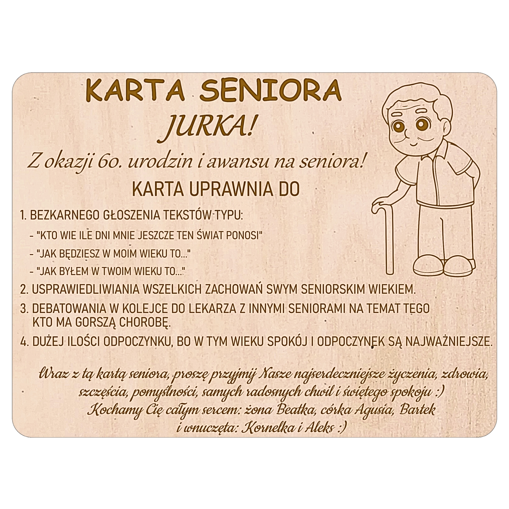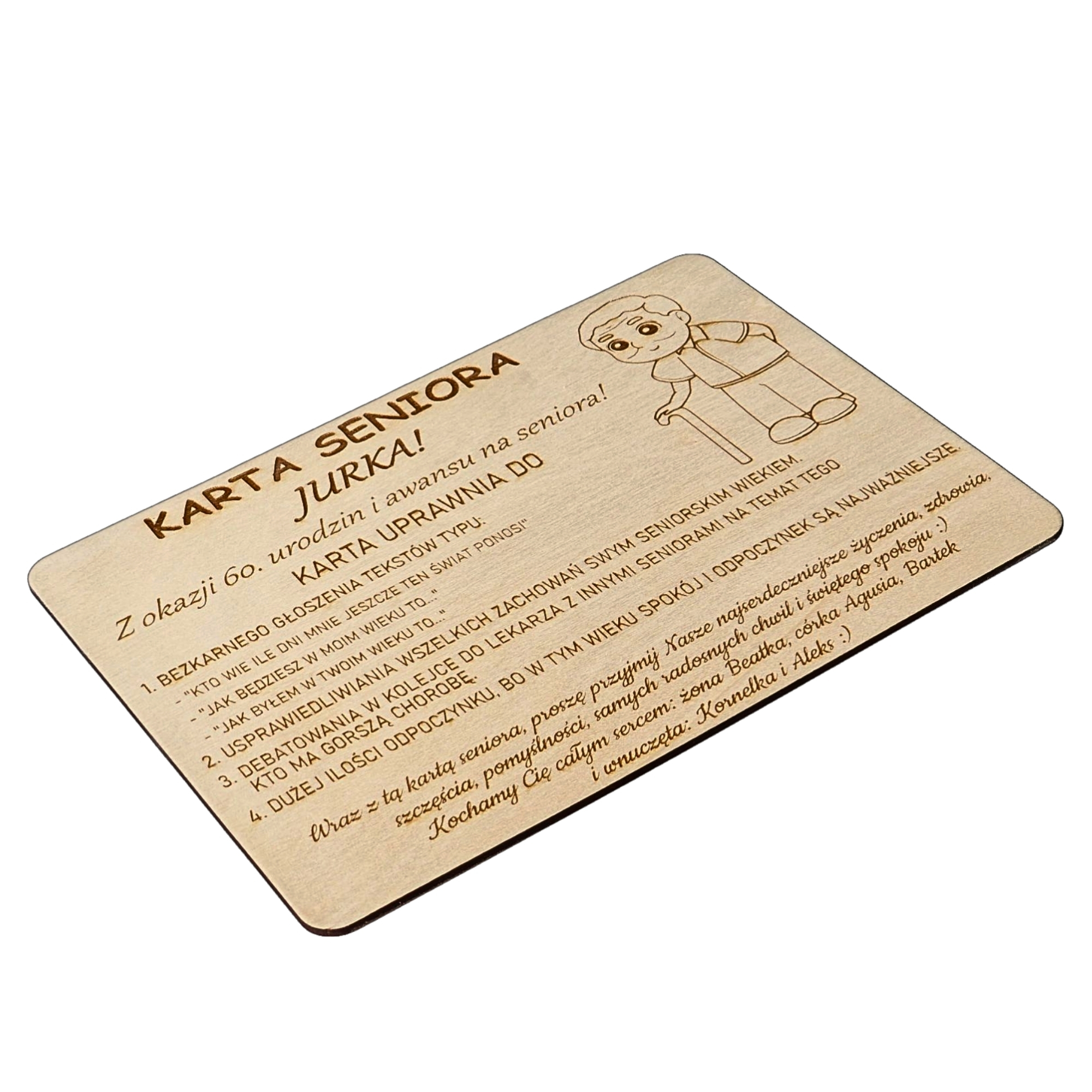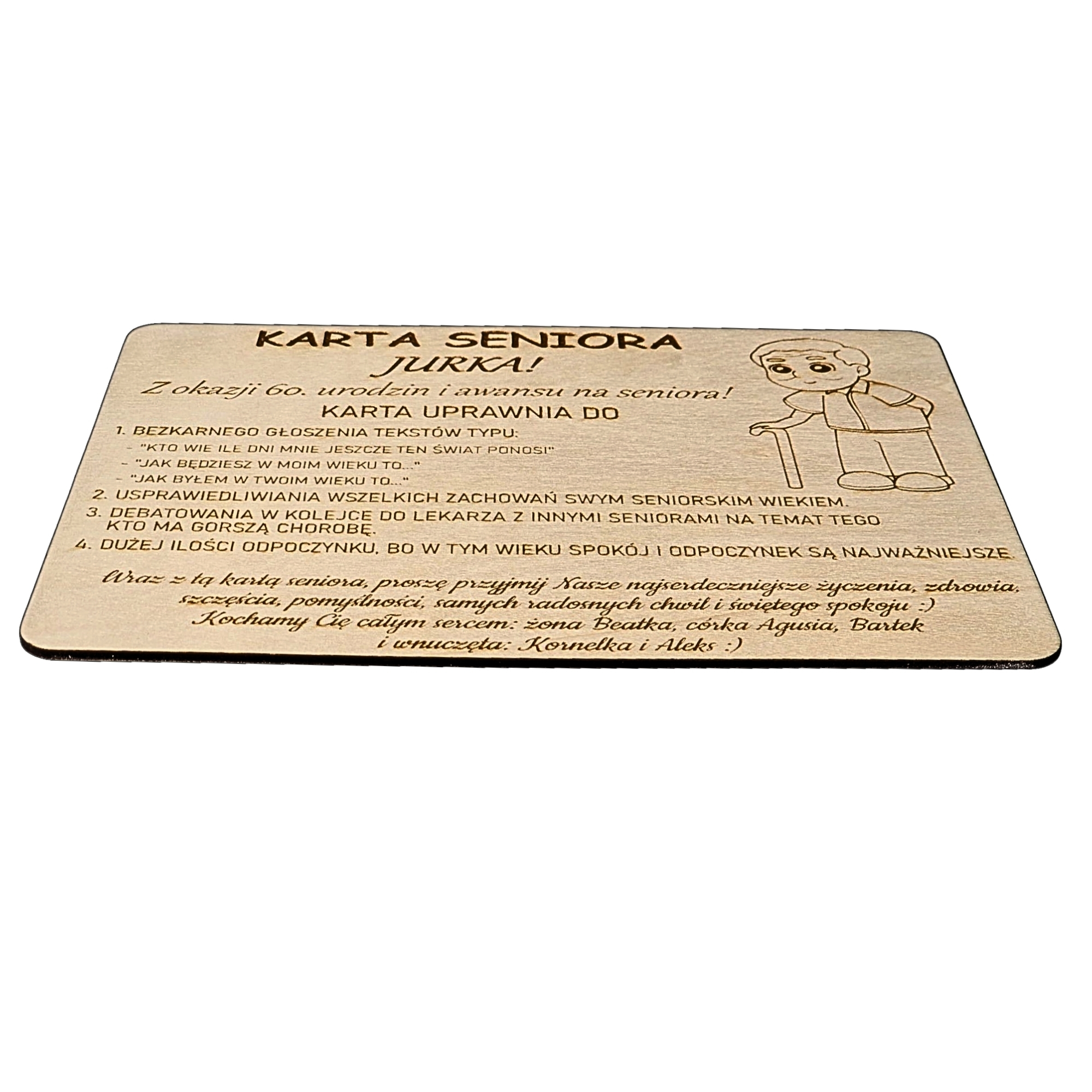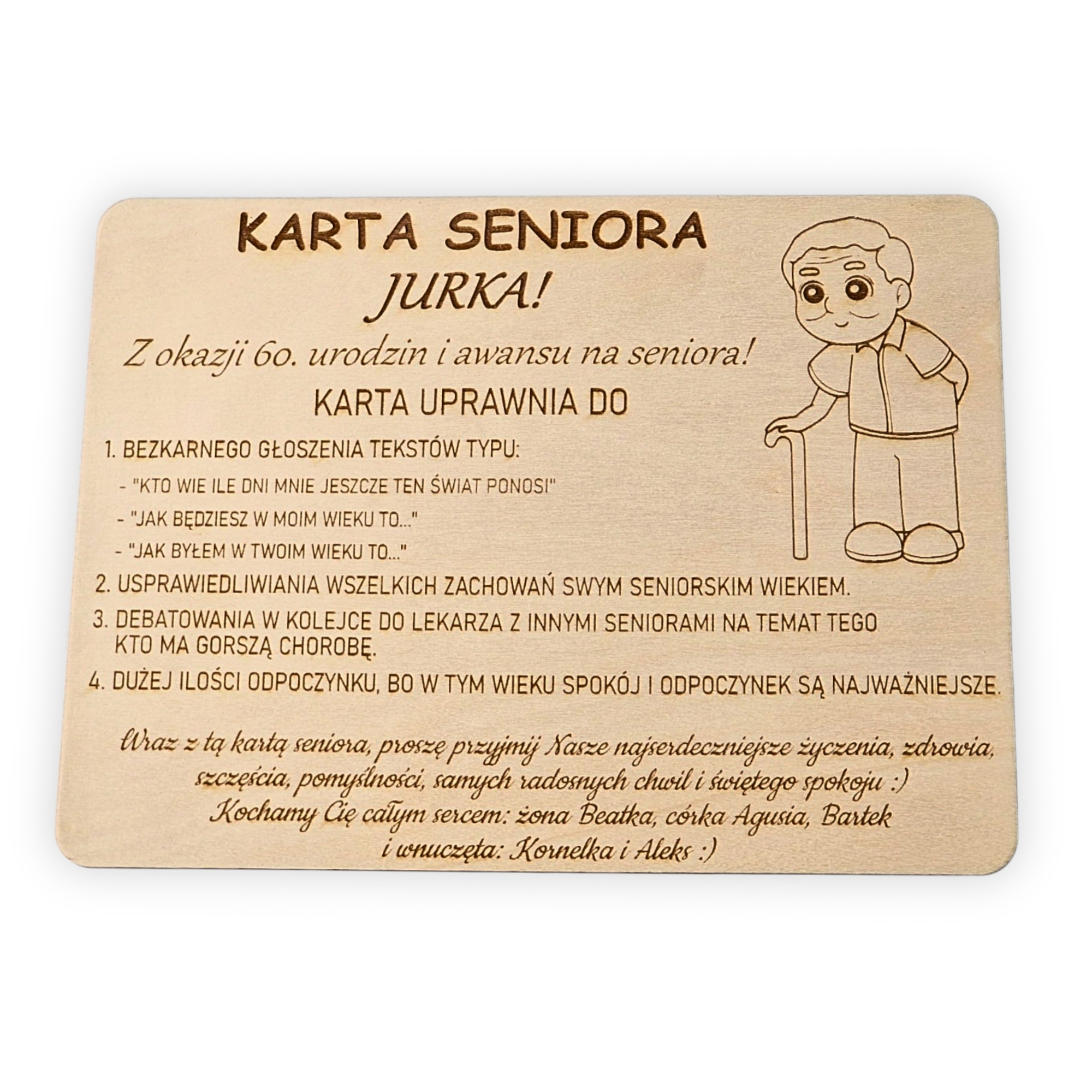 Z humorem i czułością – ta grawerowana na sklejce Karta Seniora to wyjątkowy upominek dla każdego, kto właśnie awansował do grona seniorów!