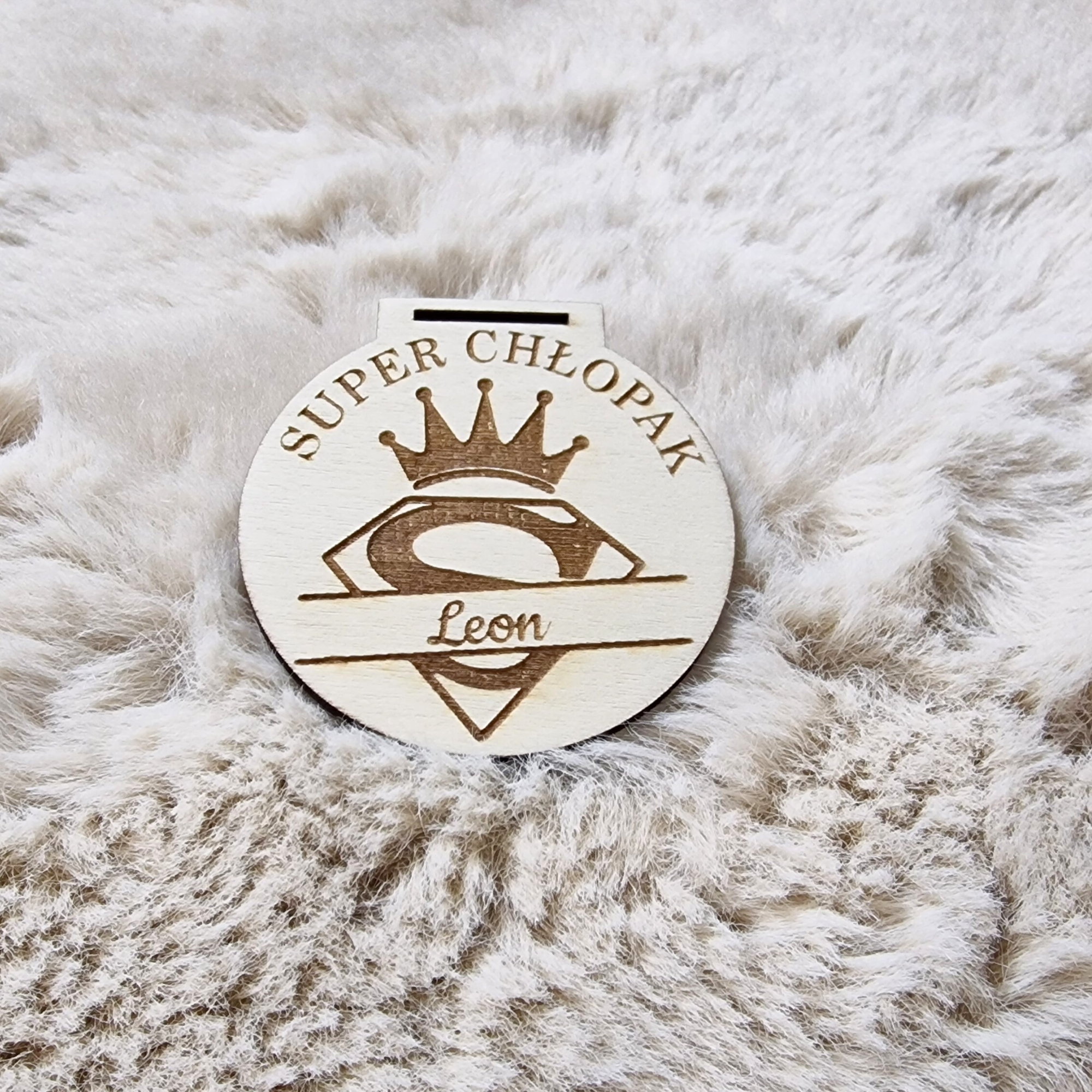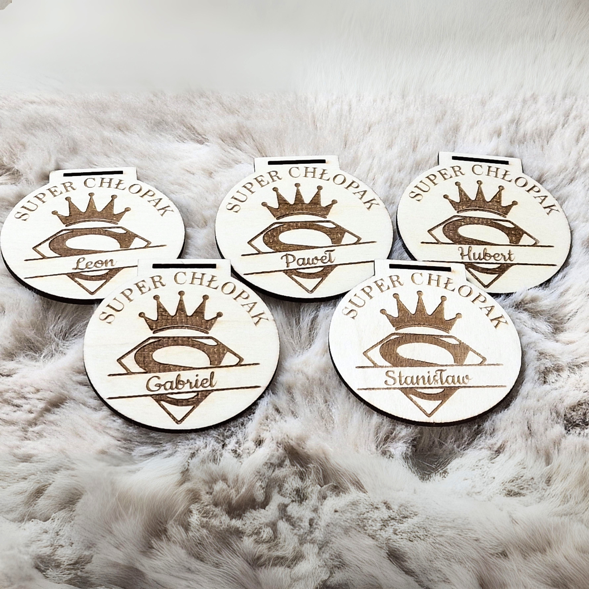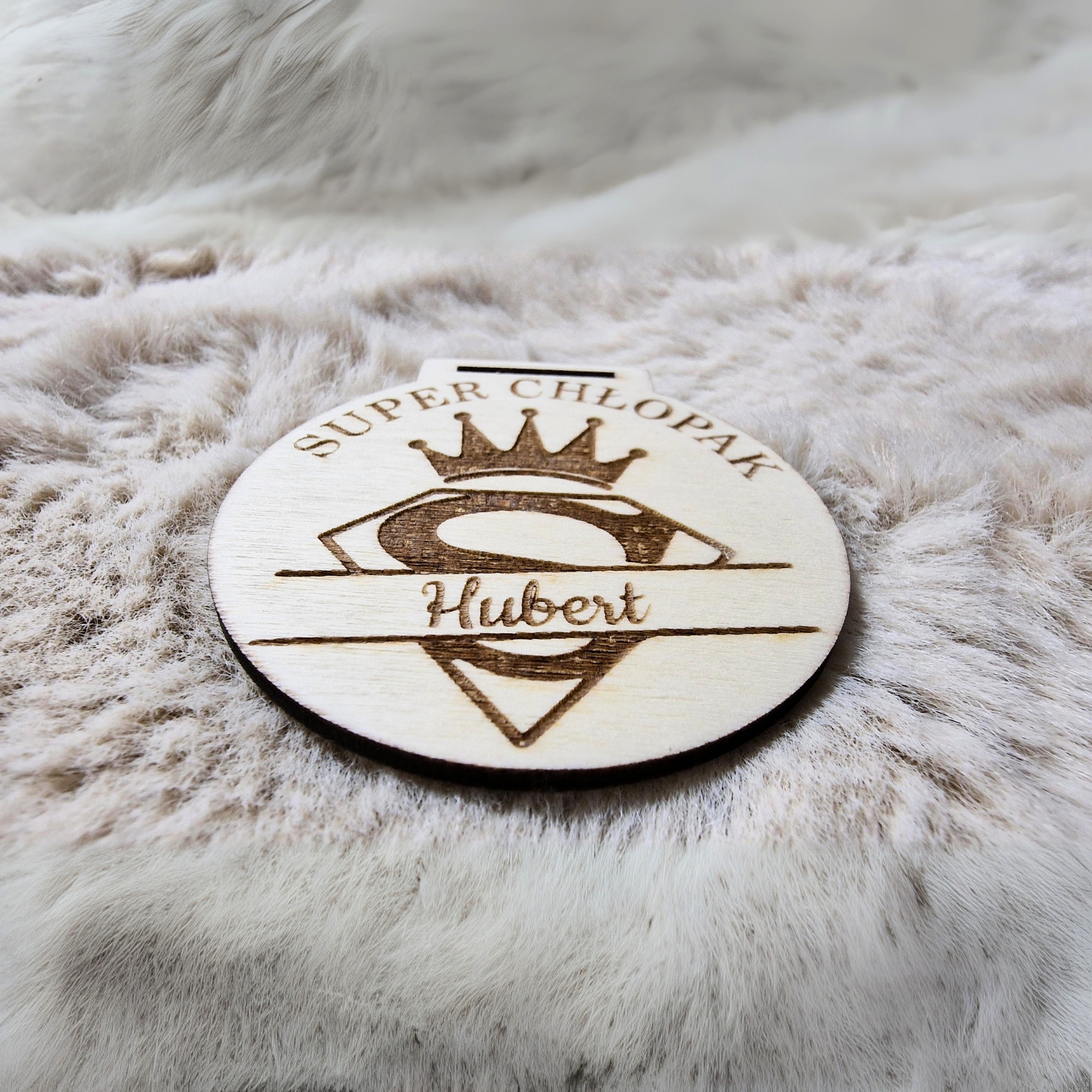 Drewniany medal personalizowany z napisem „Super Chłopak” oraz wygrawerowanym imieniem.