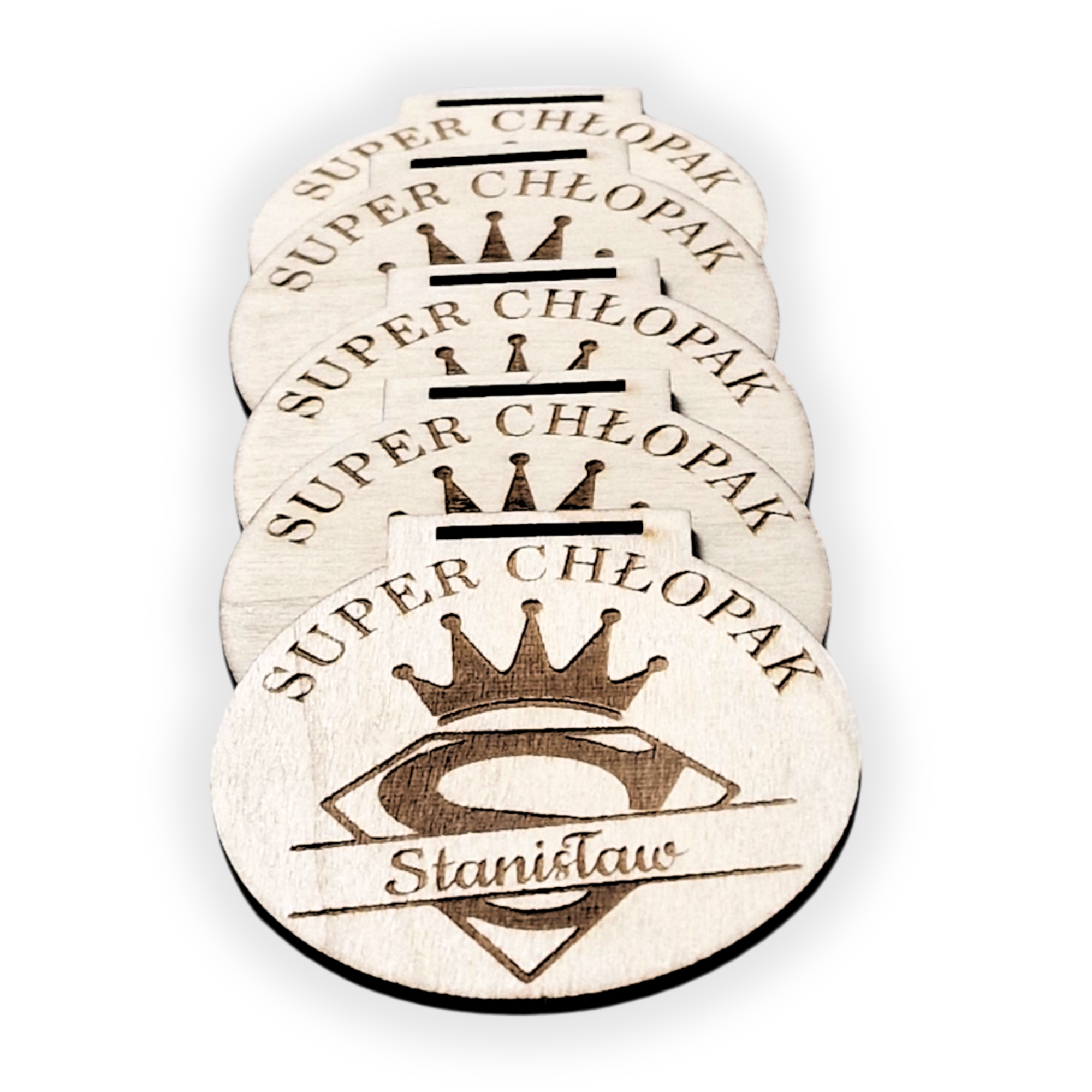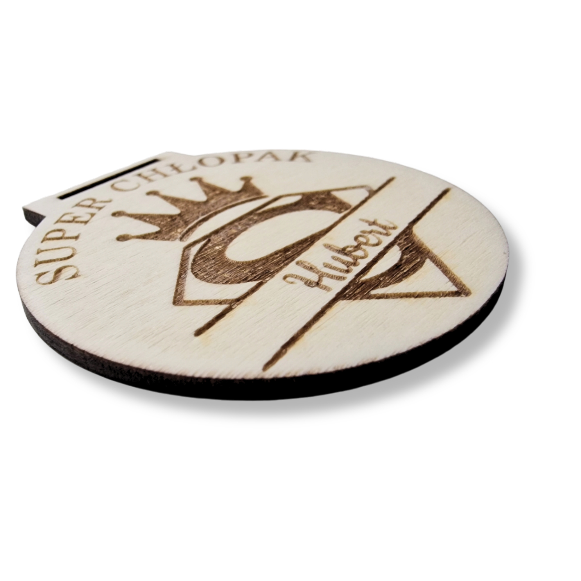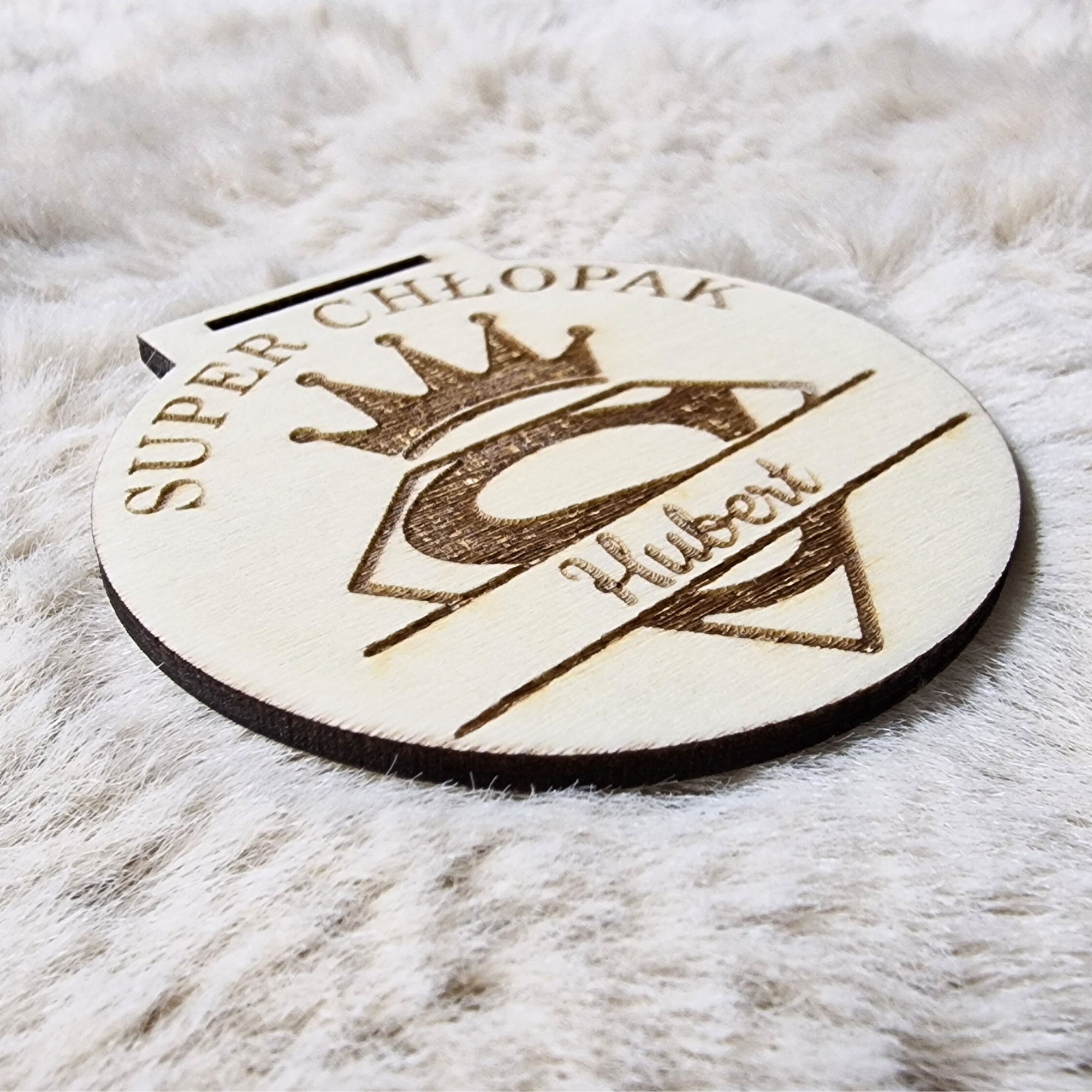 Drewniany medal personalizowany z napisem „Super Chłopak” oraz wygrawerowanym imieniem.