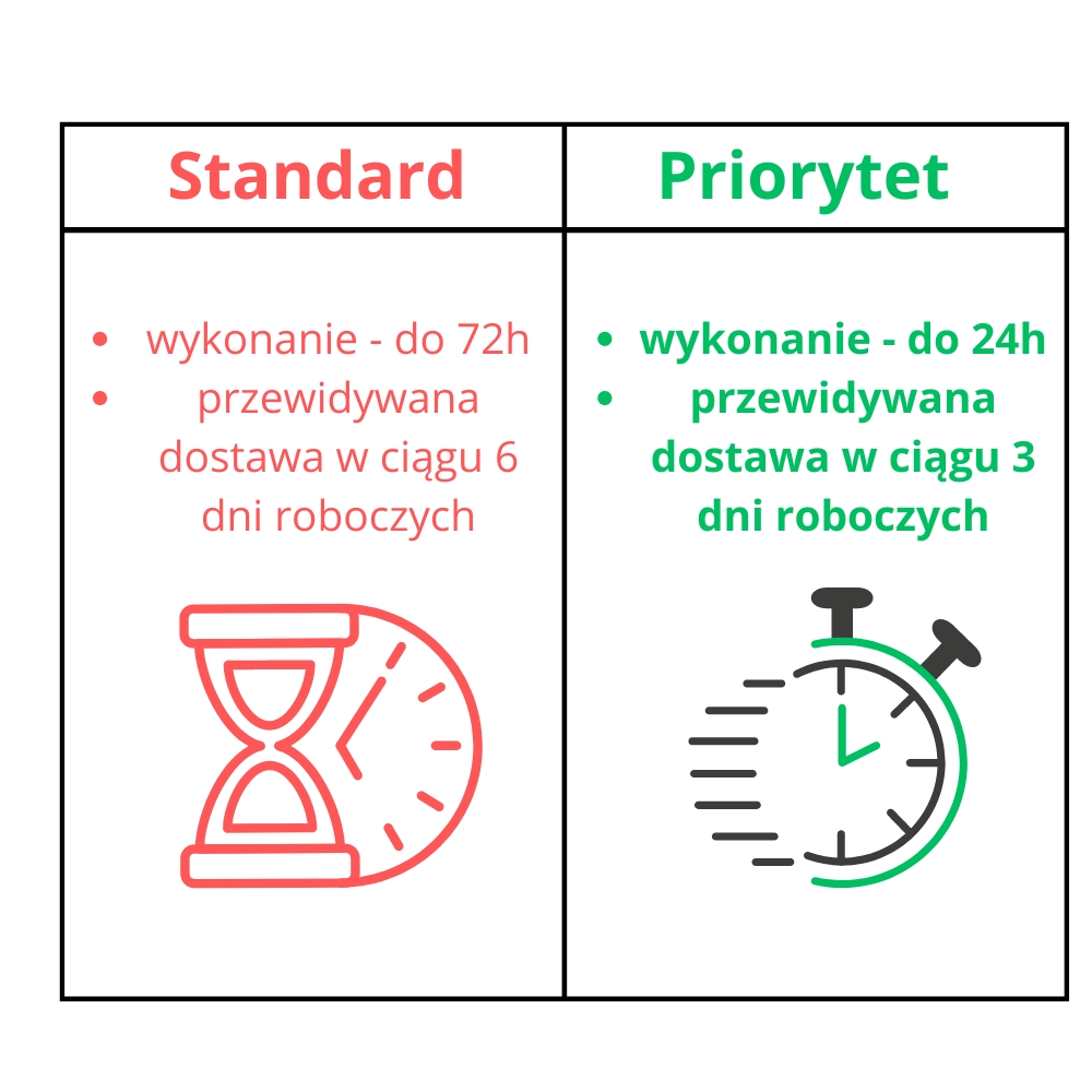 Z usługą priorytetu, jeśli złożysz zamówienie do godz. 14:00 – zostanie ono wykonane jeszcze tego samego dnia i nadane w najbliższym dniu roboczym. Jeśli zamówienie zostanie złożone w godzinach popołudniowych, wykonamy je dnia następnego i wyślemy dniu kolejnym.