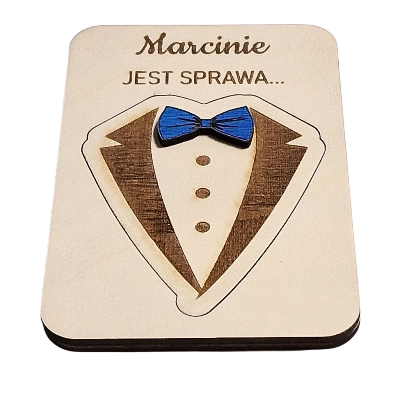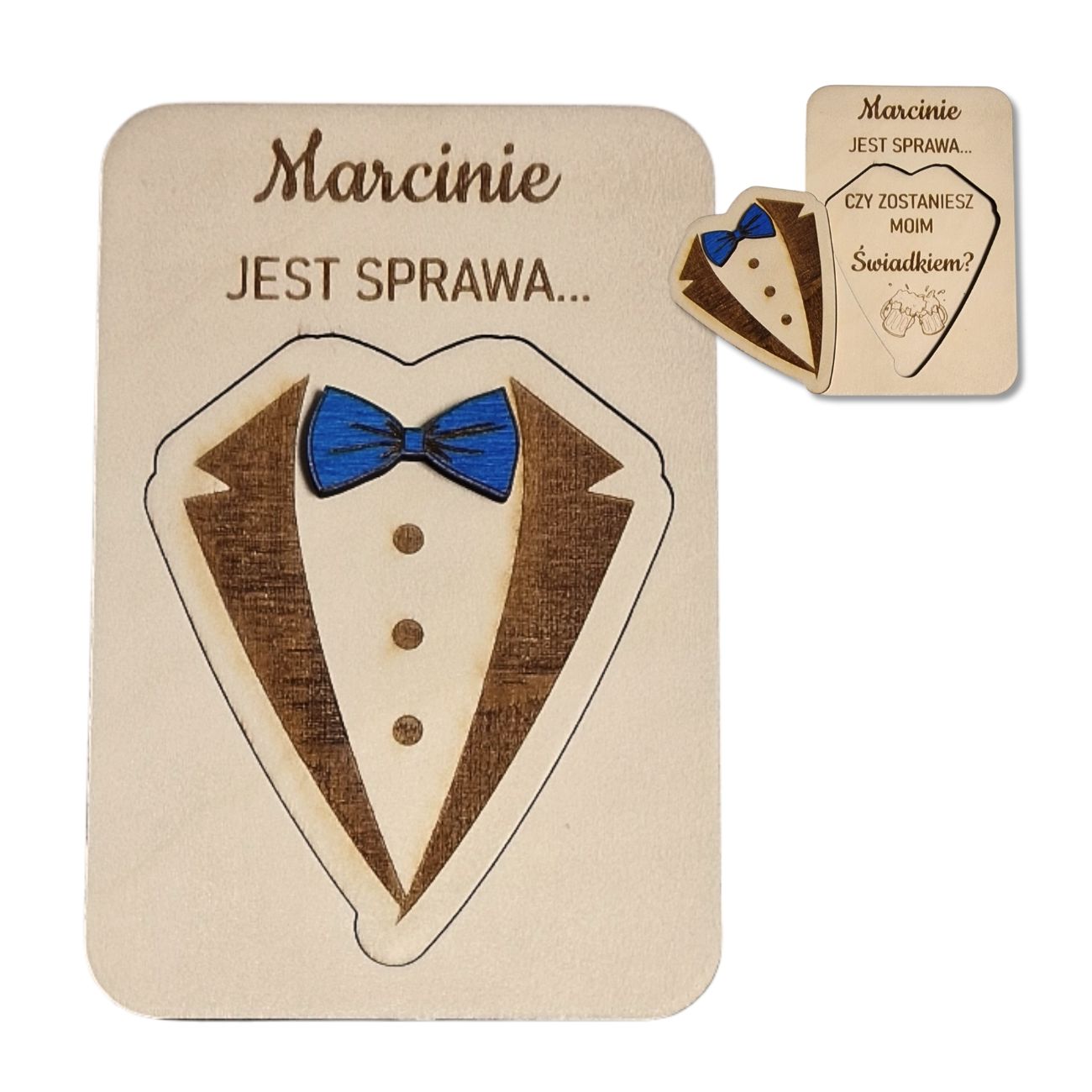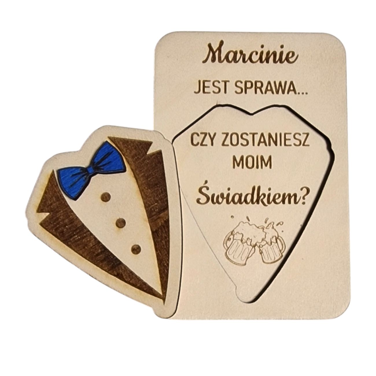 Oferujemy wyjątkowy sposób na zapytanie przyszłego Świadka o tę ważną rolę – ukryte pytanie o treści „Czy zostaniesz moim Świadkiem?” umieszczone jest pod wygrawerowanym symbolem smokingu z niebieską muszką.