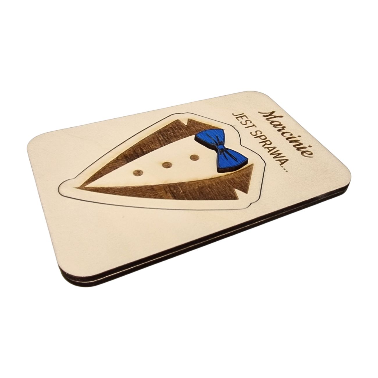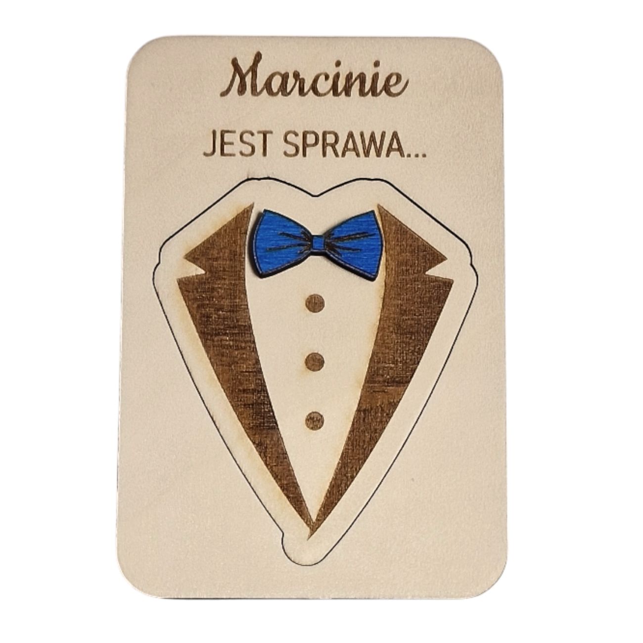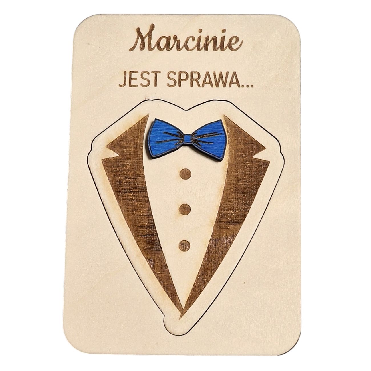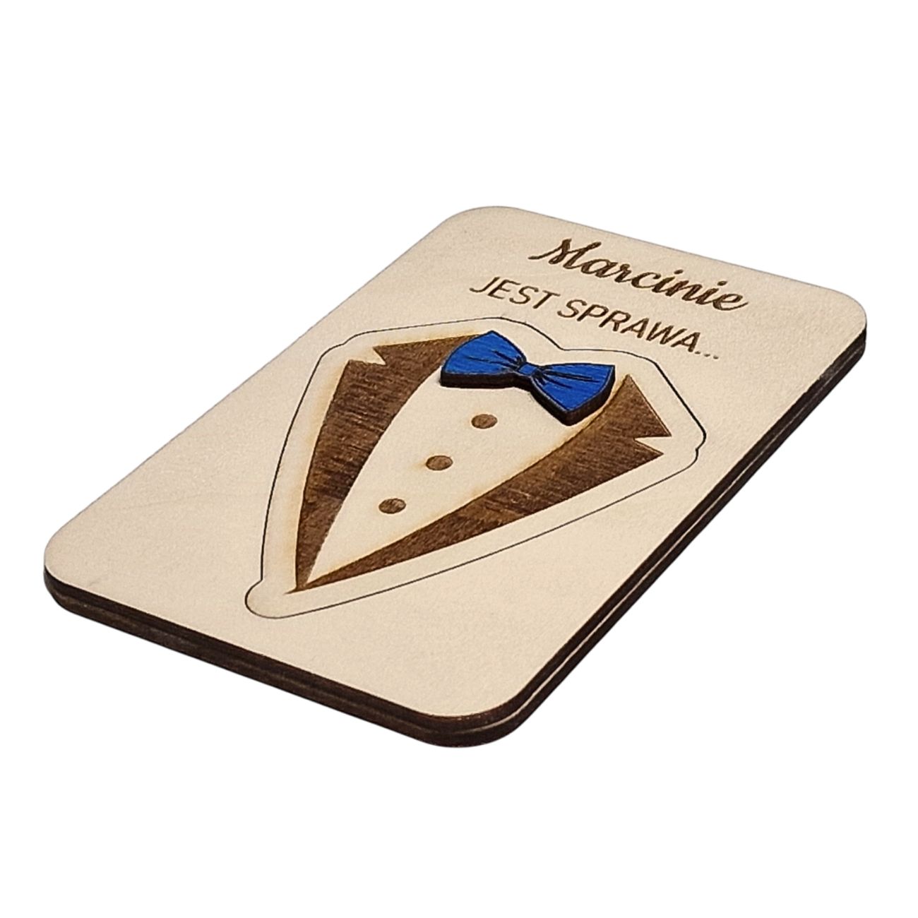 Oferujemy wyjątkowy sposób na zapytanie przyszłego Świadka o tę ważną rolę – ukryte pytanie o treści „Czy zostaniesz moim Świadkiem?” umieszczone jest pod wygrawerowanym symbolem smokingu z niebieską muszką.