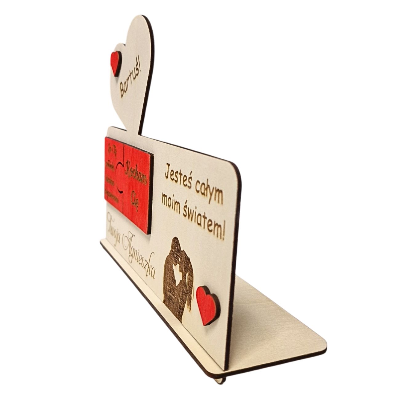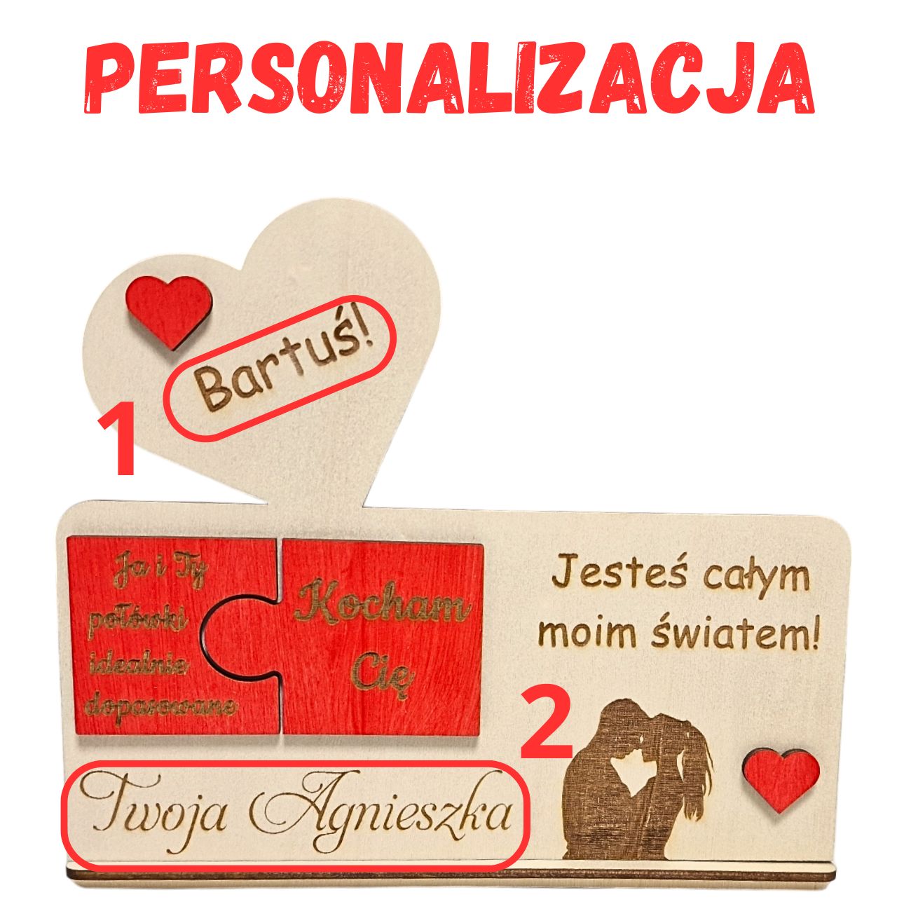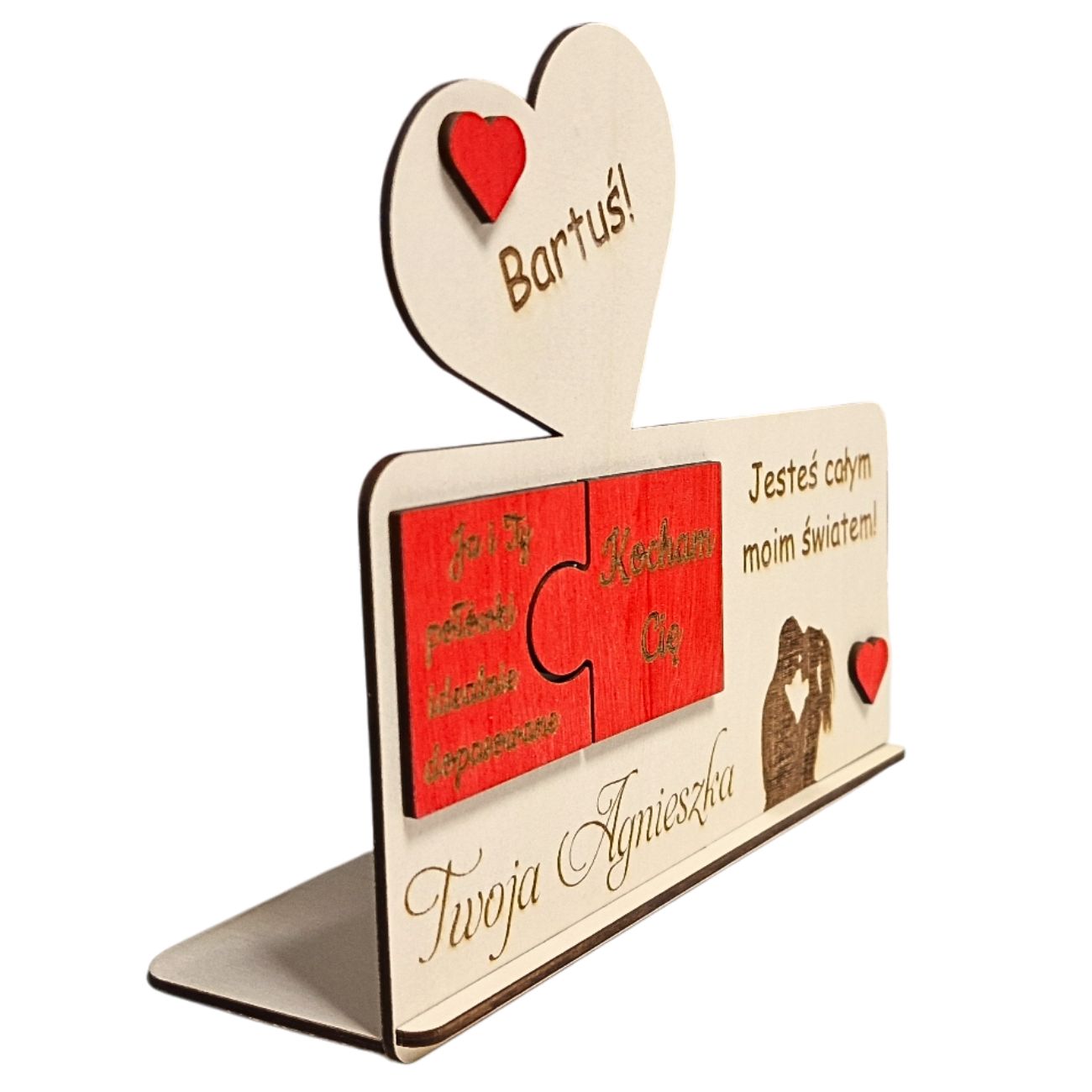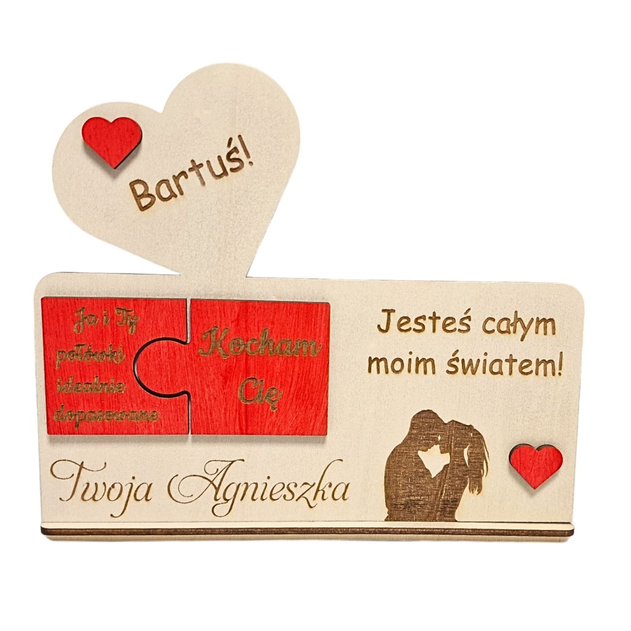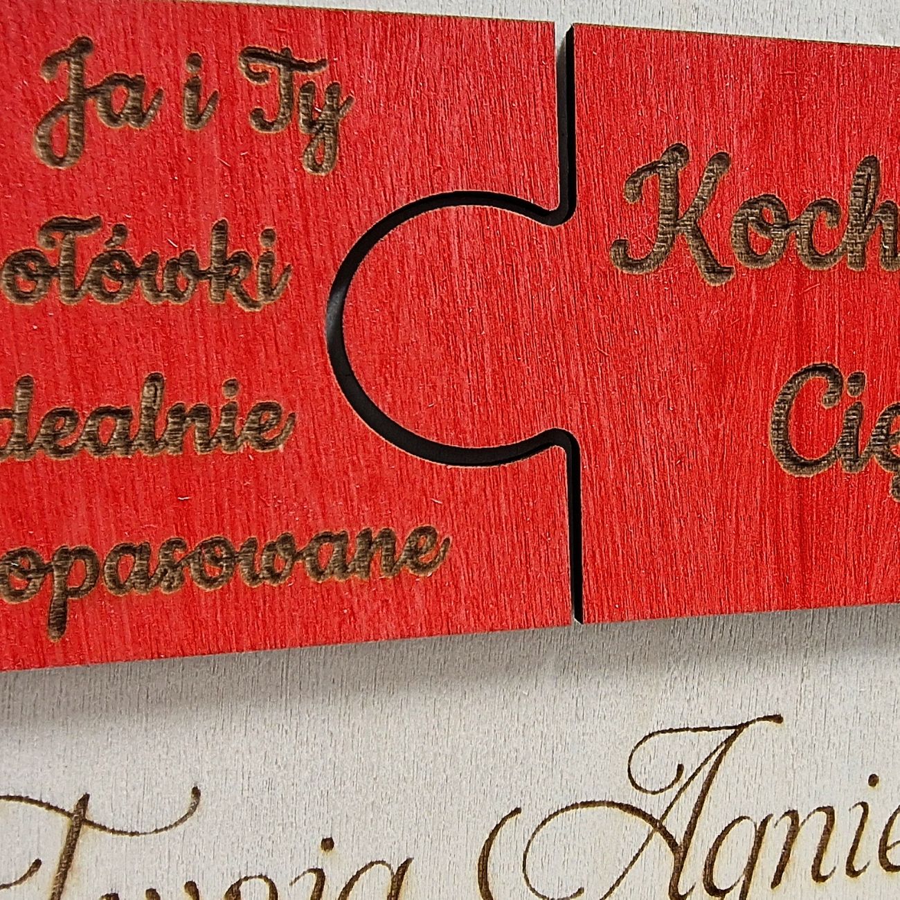 Zawiera przyklejone ręcznie malowane puzzle z wygrawerowanym tekstem „Ja i Ty połówki idealnie dopasowane” oraz „Kocham Cię”.