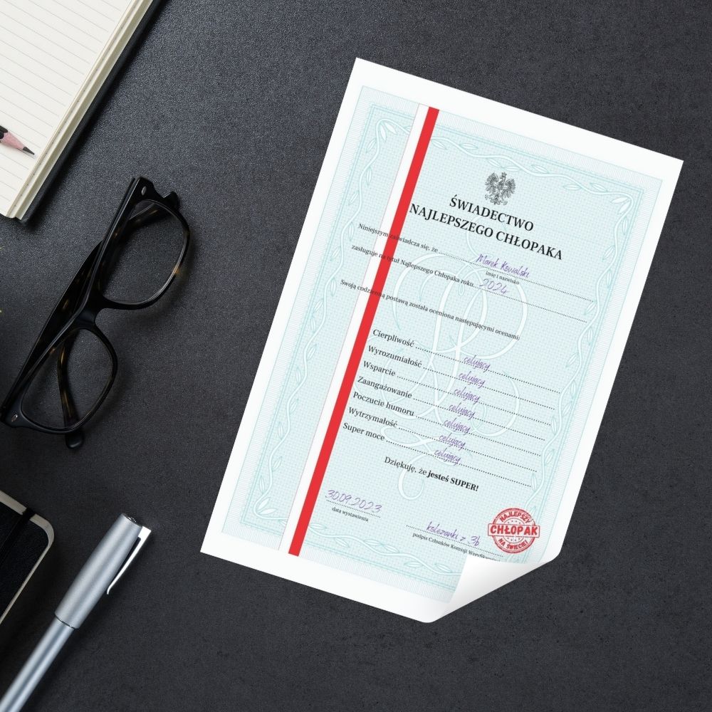 Prezent dla CHŁOPAKA – Świadectwo Najlepszego Chłopaka. Idealny prezent na Dzień Chłopaka lub Urodziny.