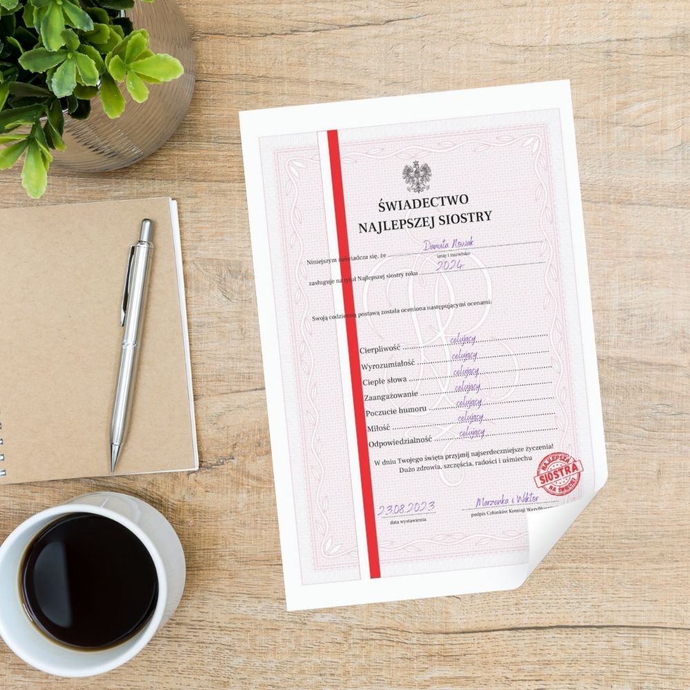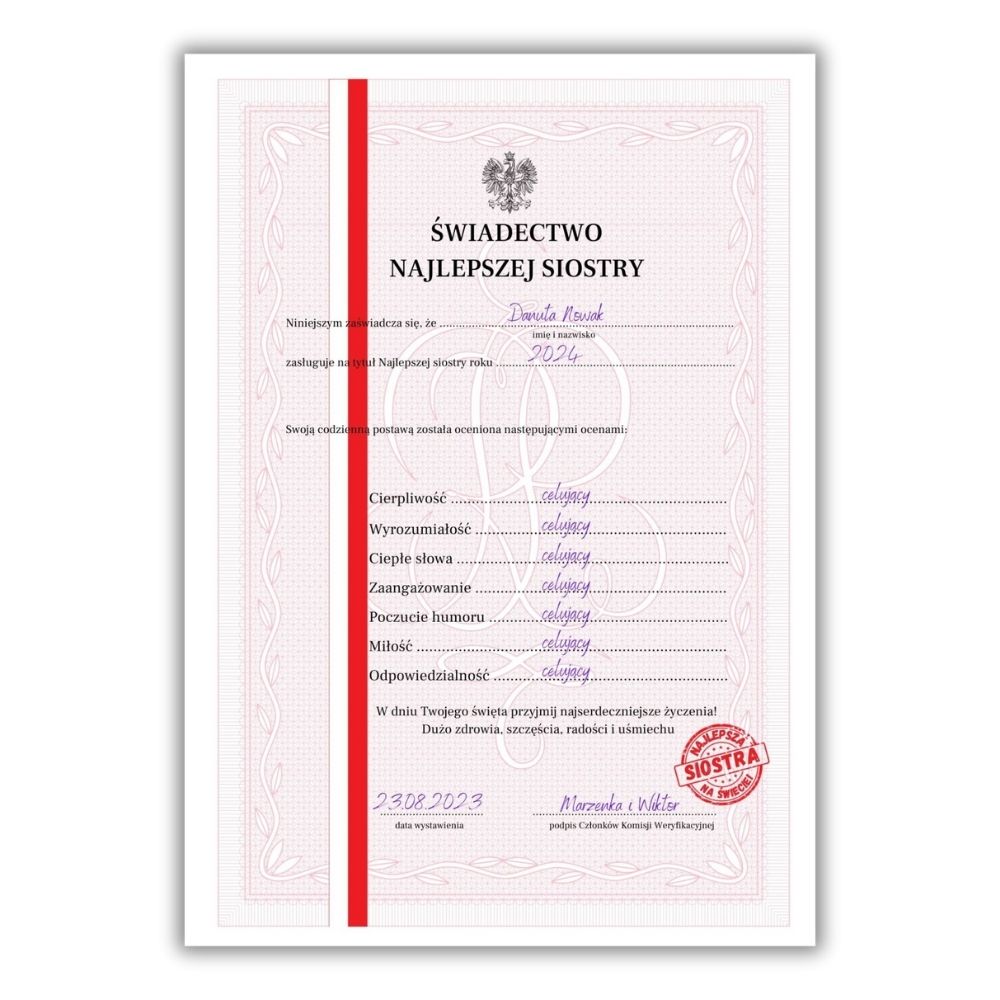 Prezent dla Siostry – Świadectwo Najlepszej Siostry. Idealny prezent na Urodziny lub inną okoliczność.