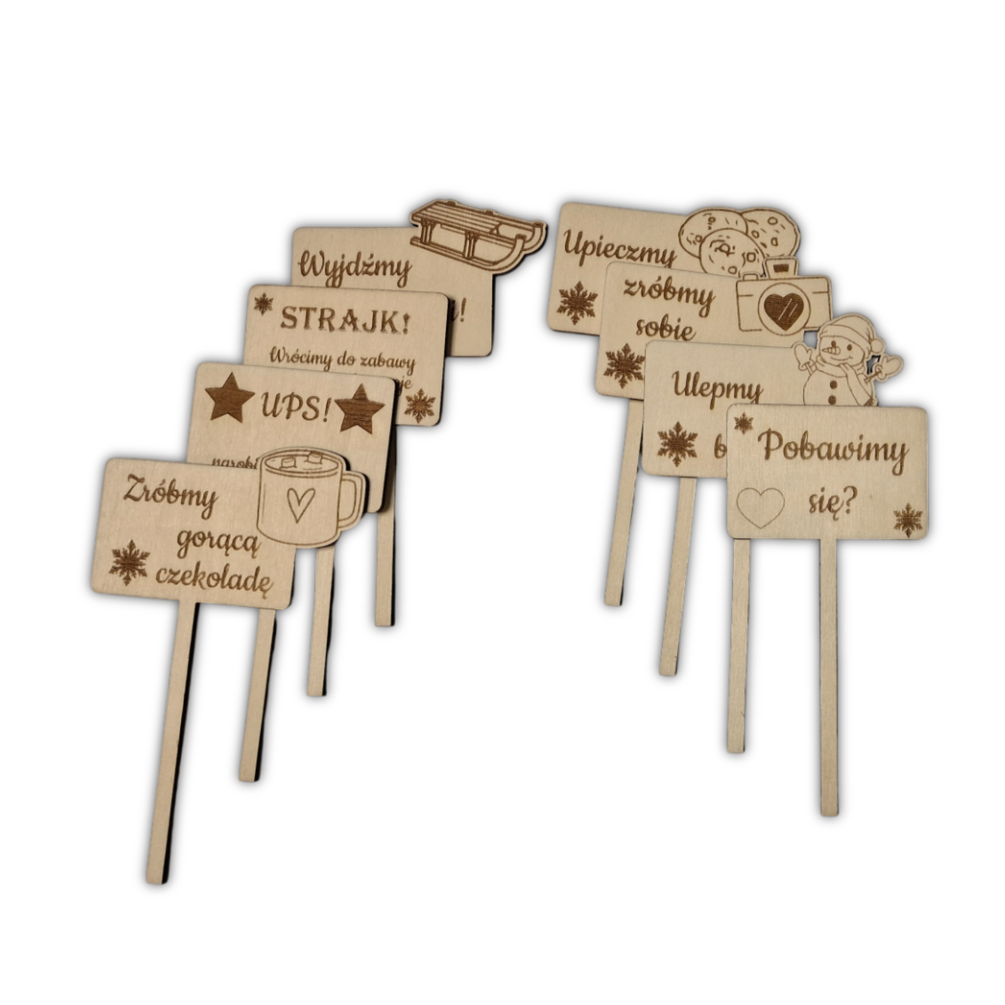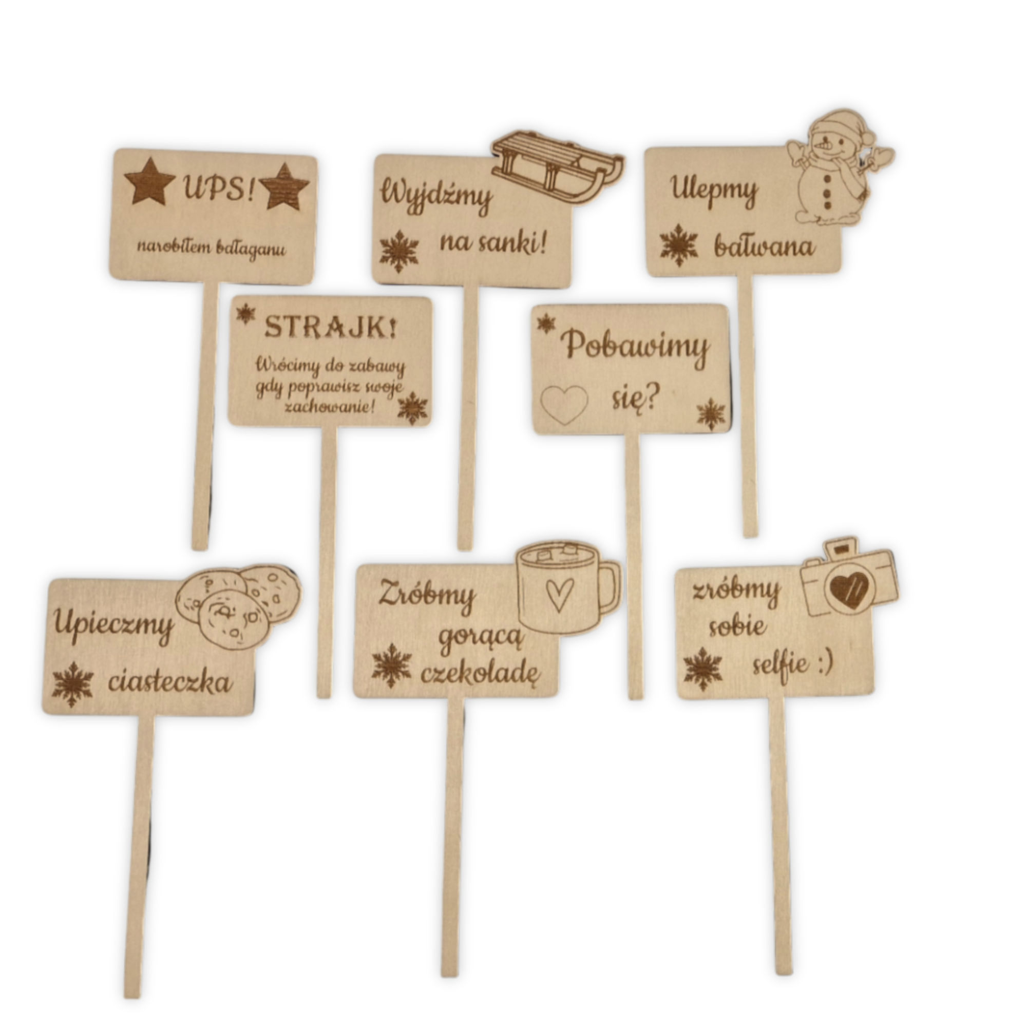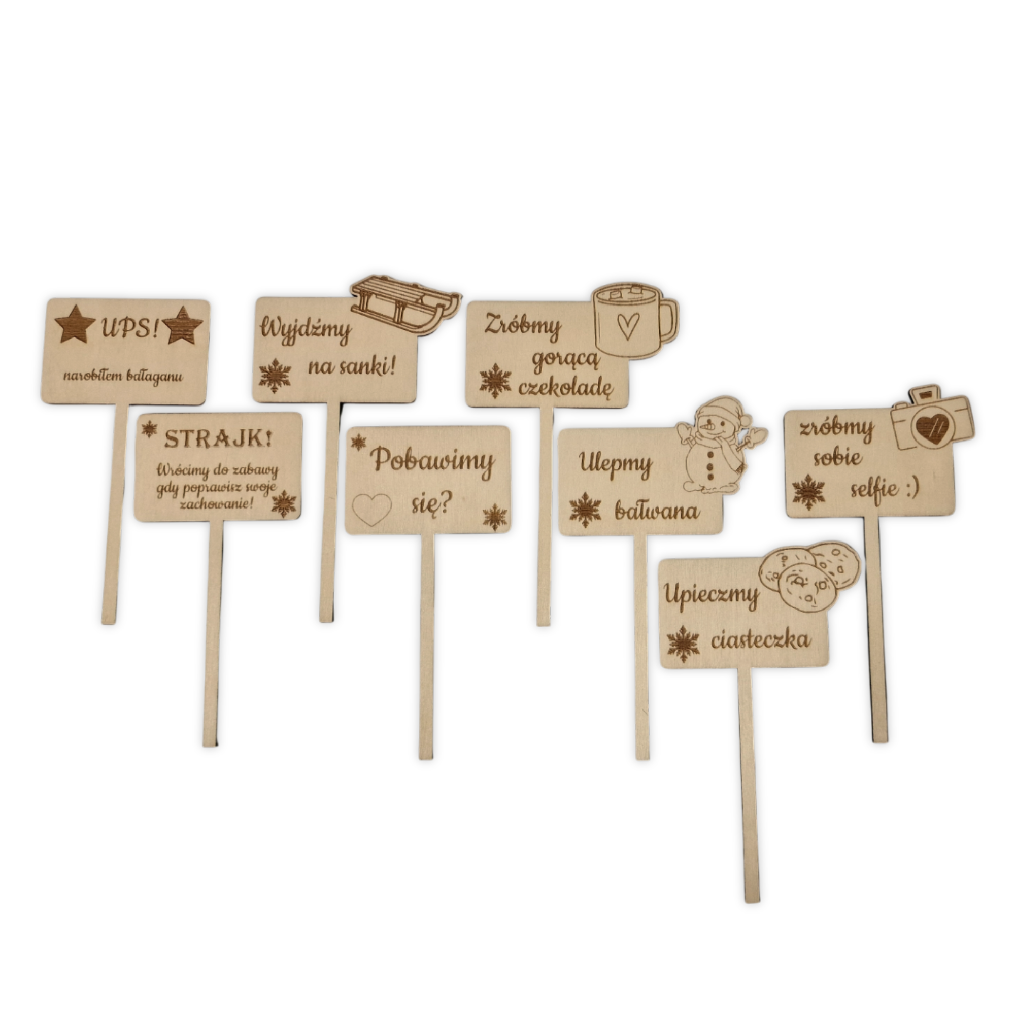 Tabliczki na patyku dla Elfa Psotnika – akcesorium, które towarzyszy Elfowi podczas wizyty w okresie przedświątecznym.