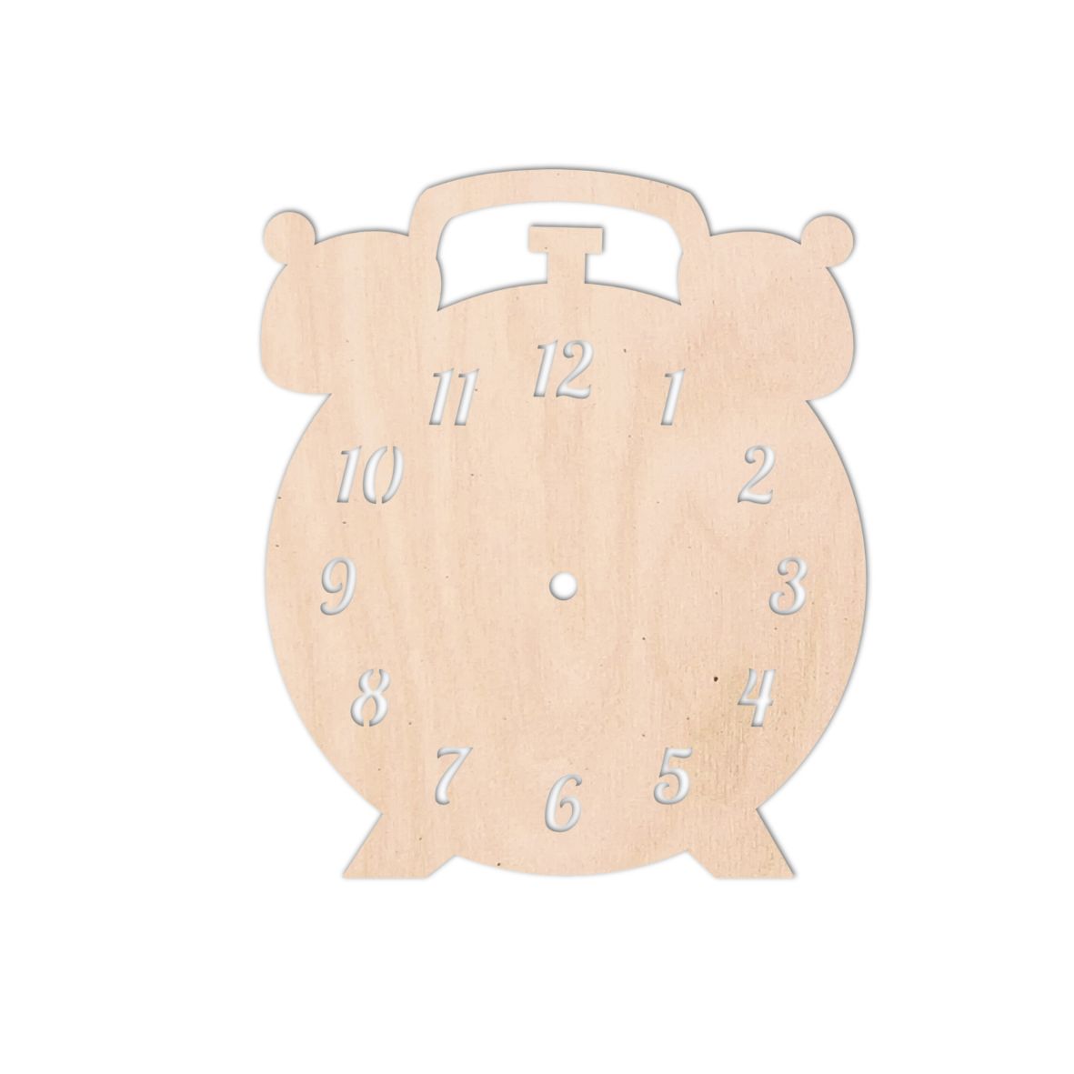 Tarcza zegara o kształcie budzika w wyciętymi wewnątrz cyframi.