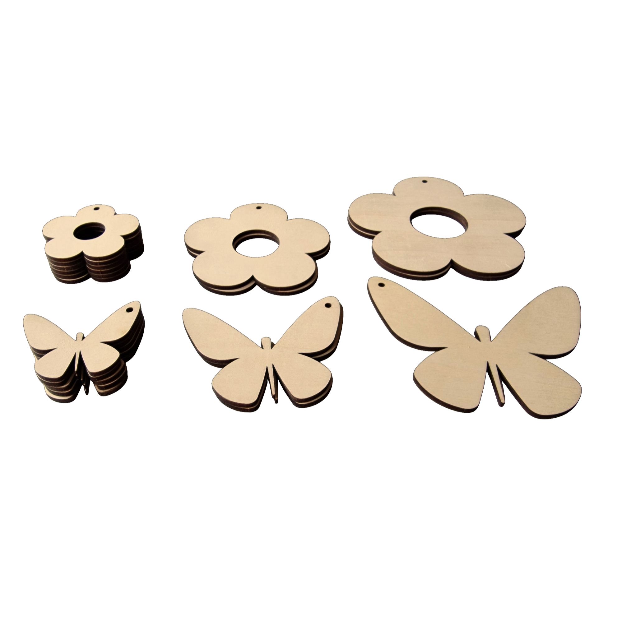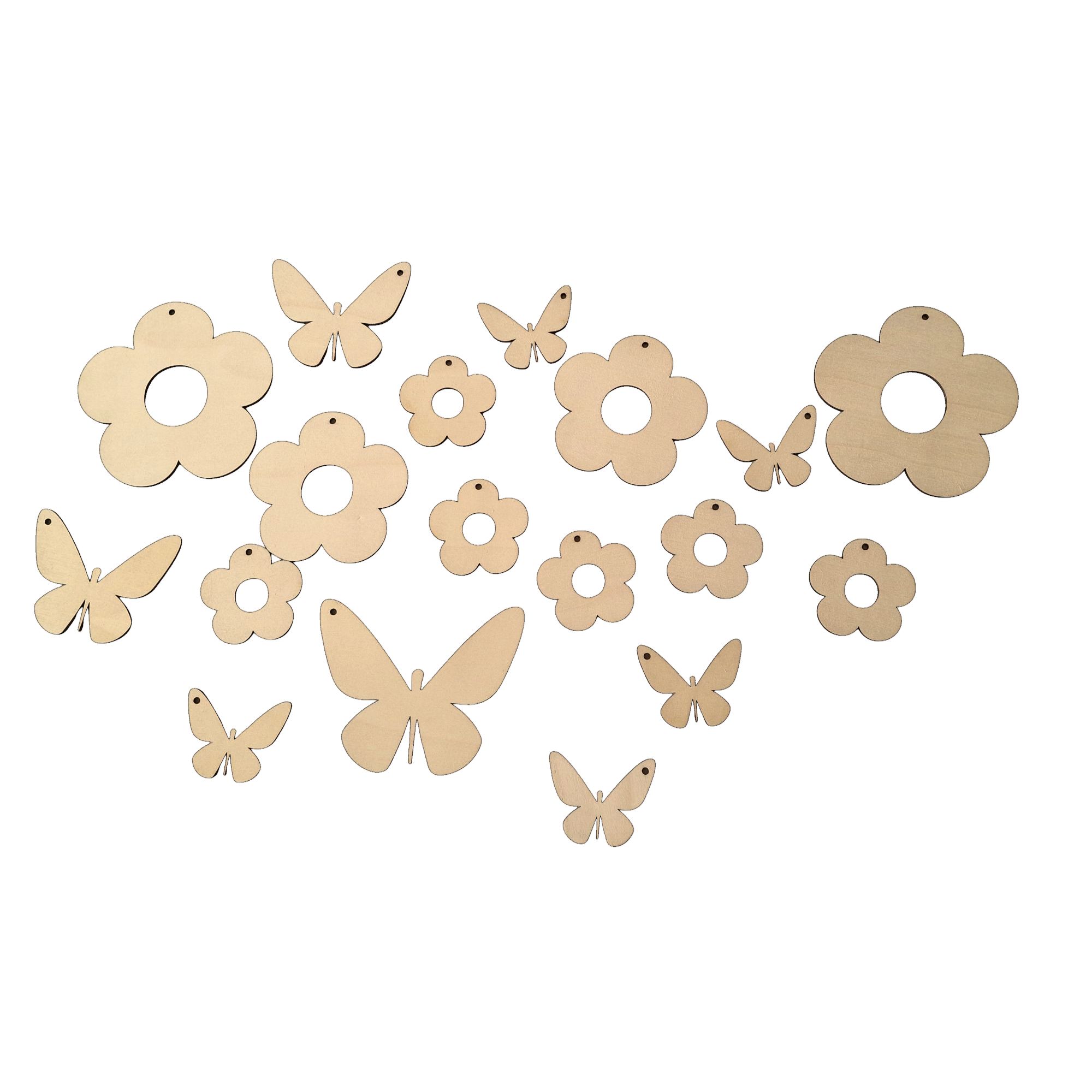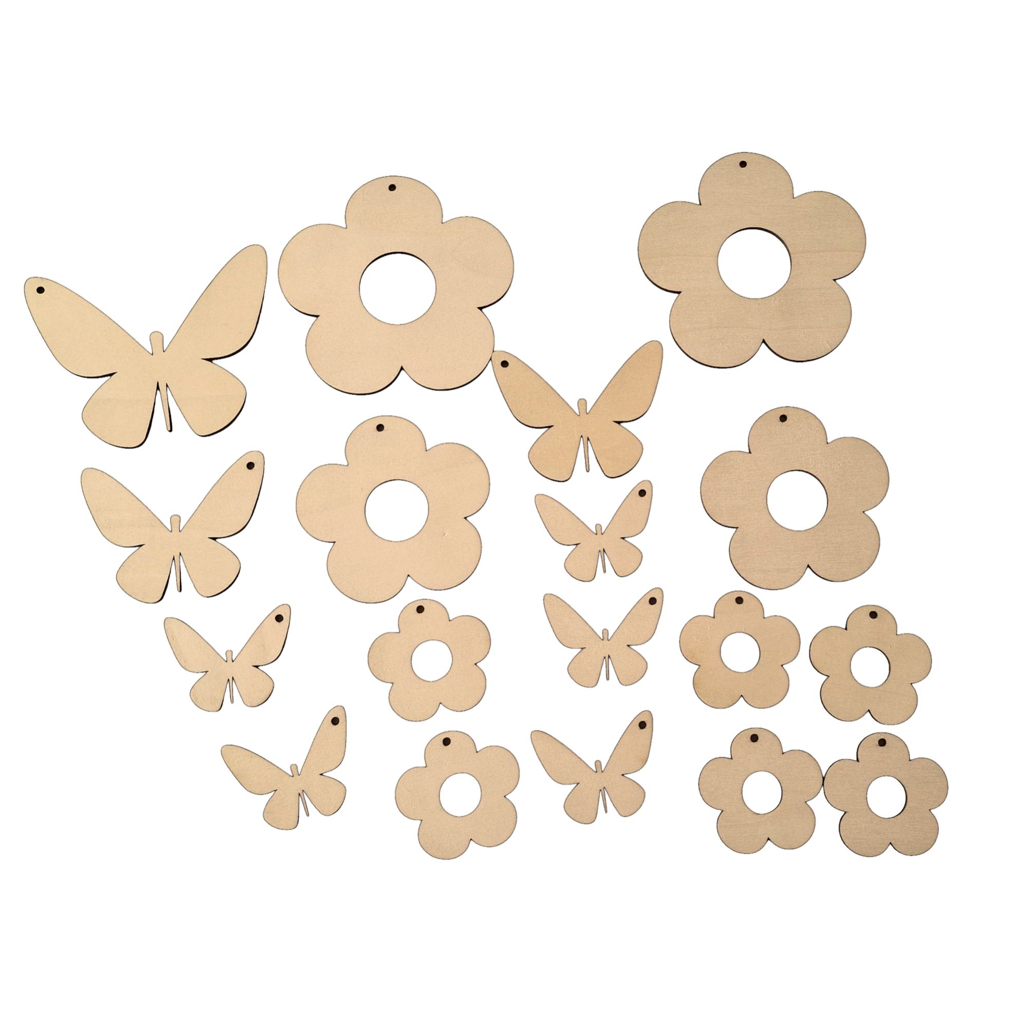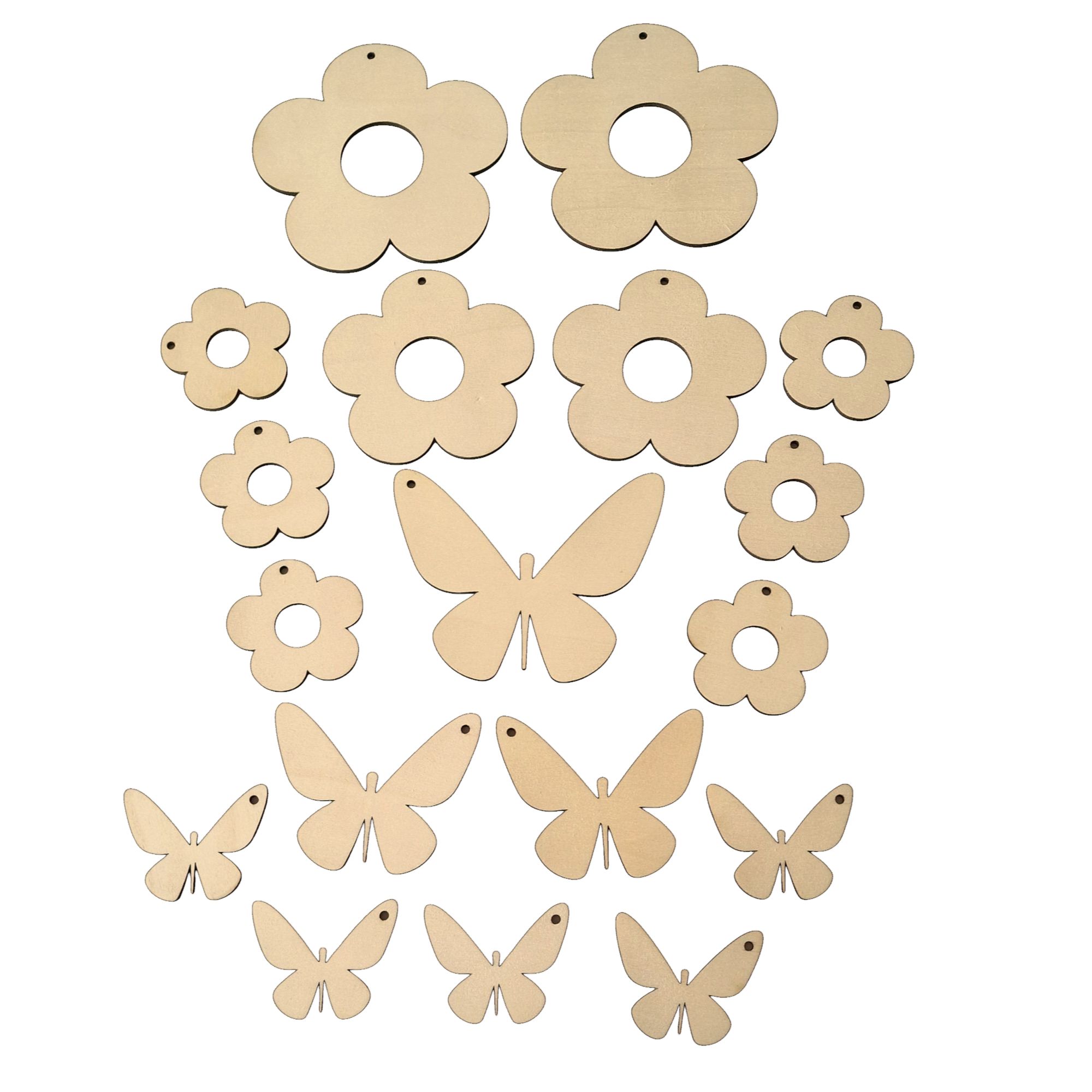 Zawieszki w kształcie motyli i kwiatów o różnych rozmiarach. Idealne do wykonania dekoracji wiosennej. Produkt można dowolnie pokolorować (kredkami lub pisakami)