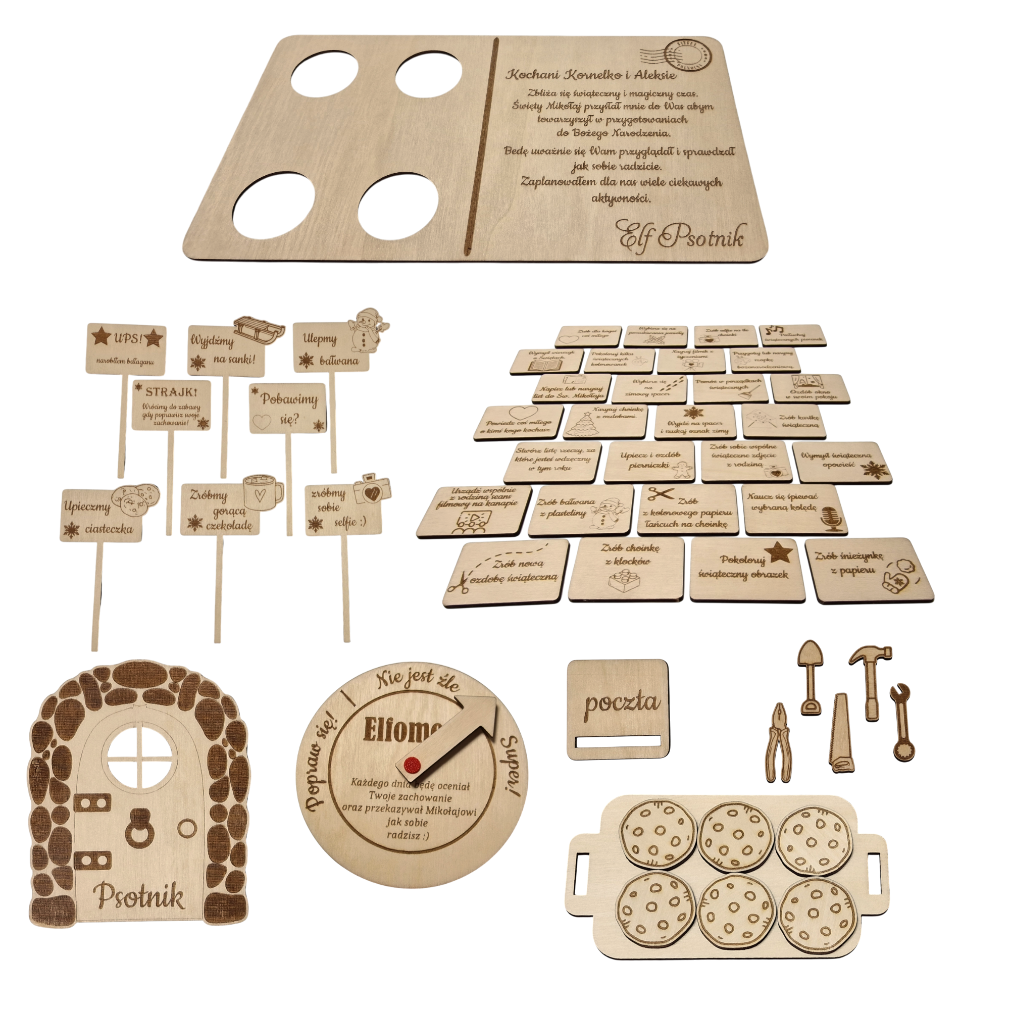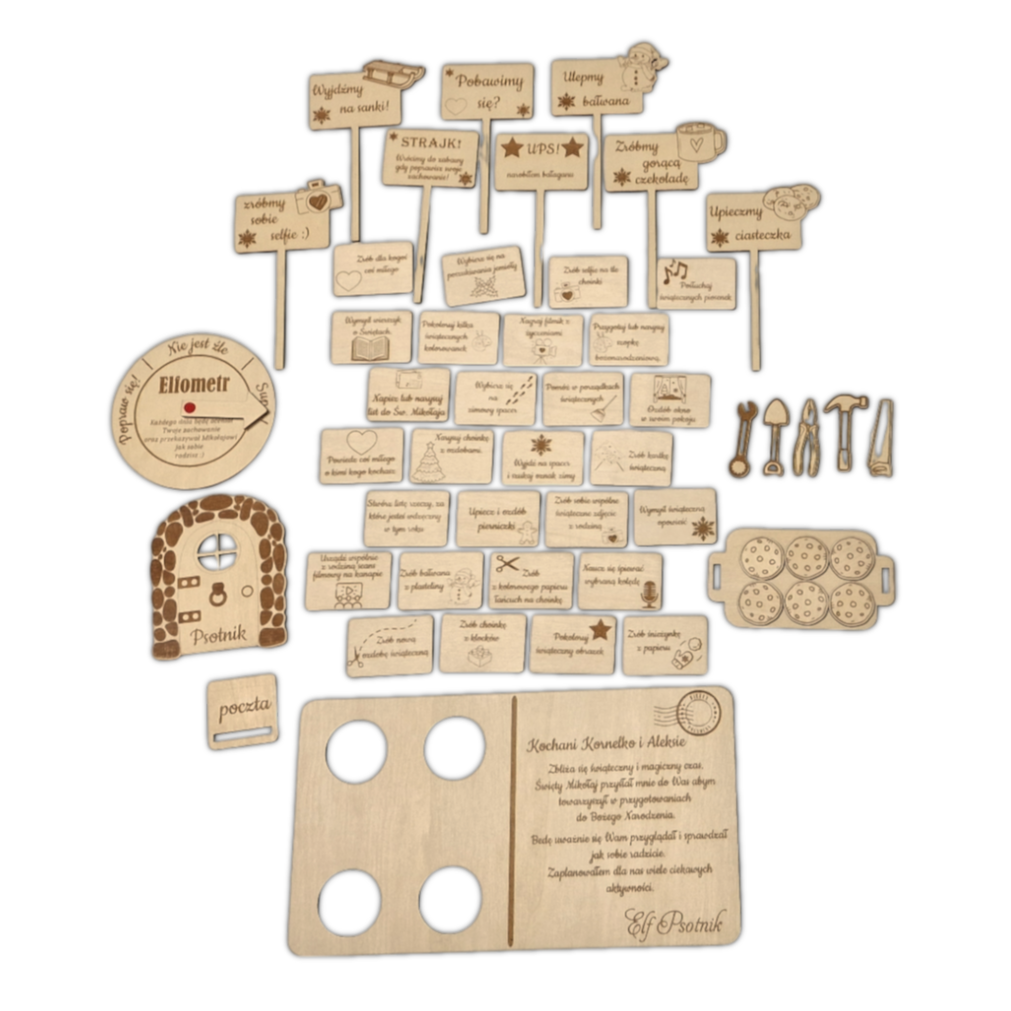 - Zestaw Elfickich narzędzi (kombinerki, łopata, młotek, piła, klucz) dzięki którym Elf może psocić i majstrować
